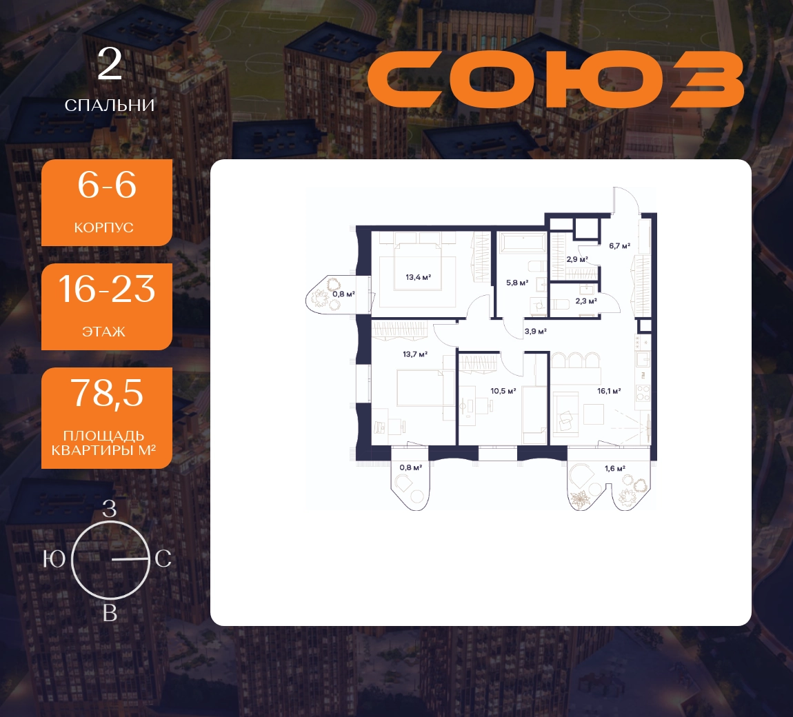 Рассрочка 0%Продаётся 3-комнатная квартира площадью 78.5 м² на 16 этаже в Жилом Комплексе «Союз».