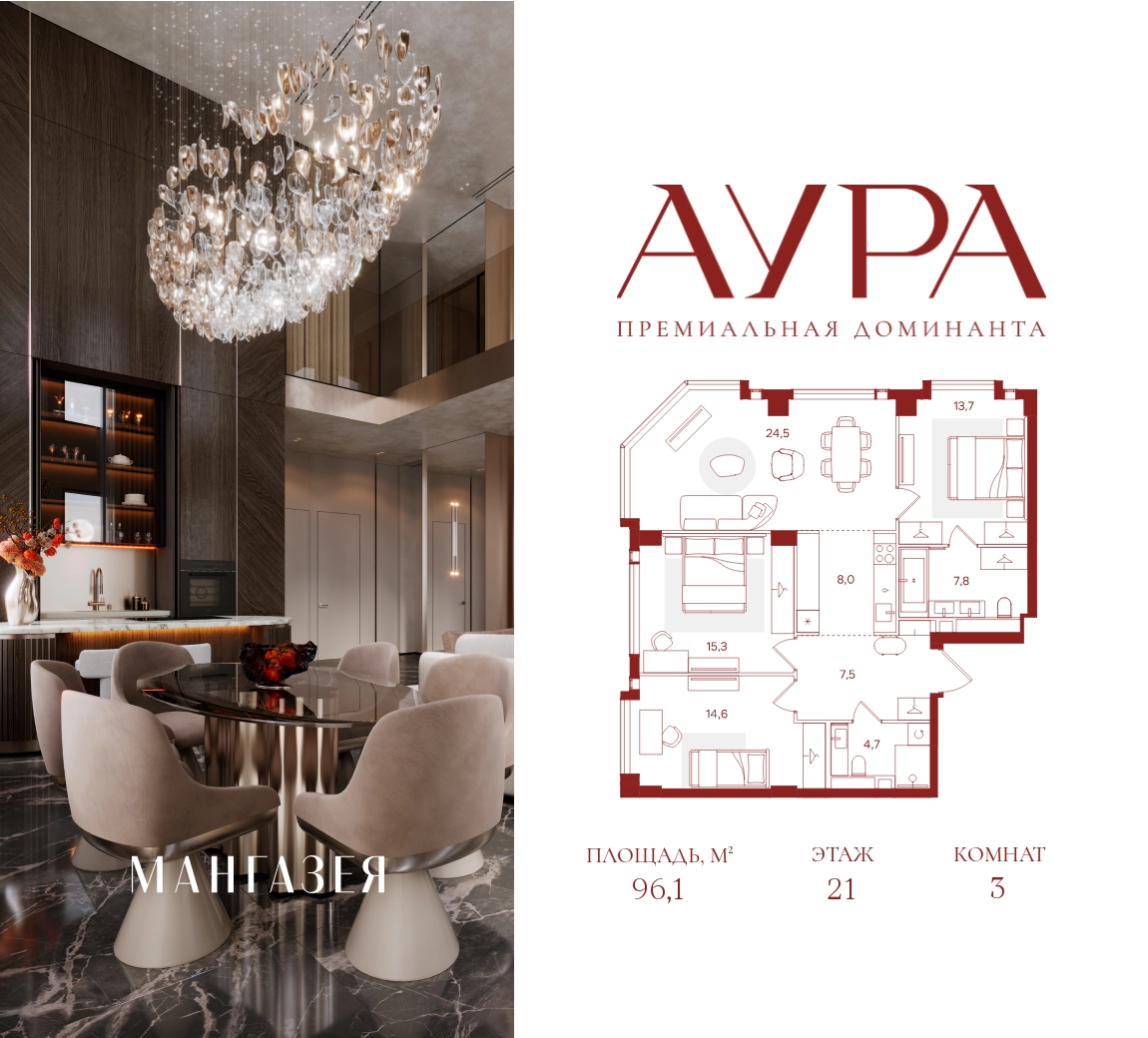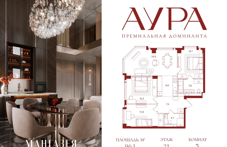 3-комнатная квартира площадью 96.10 м2. Высота потолков – 3.16 м. Этаж 21 из 41. Вид из окон - на две стороны света.О проекте АУРА новая премиальная доминанта Москвы в 10 минутах от Садового кольца. Проект состоит из 42-этажной Бронзовой башни и 41-этажной Серебряной. Рядом набережная Москвы-реки, Даниловский рынок, музеи и галереи, престижные школы и вузы.