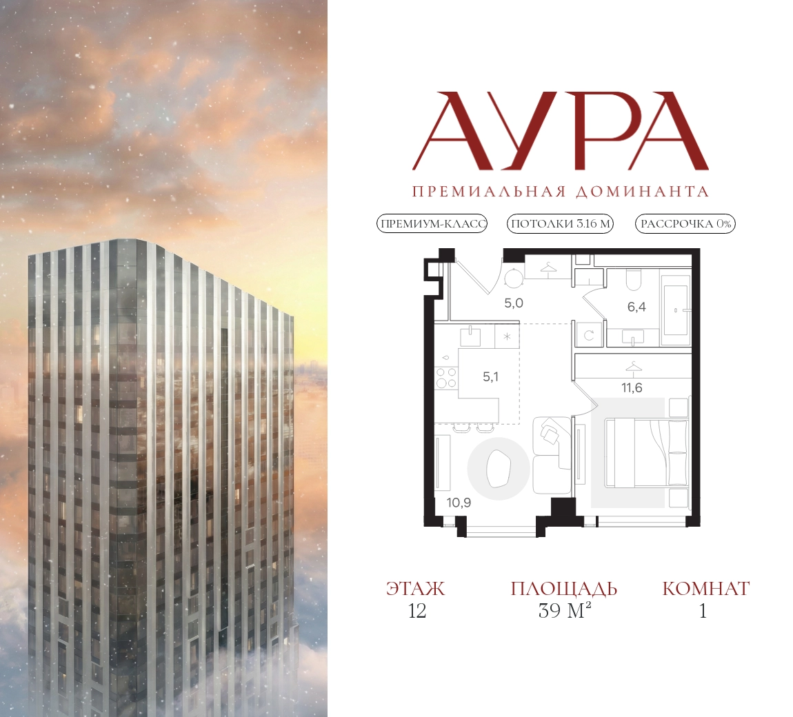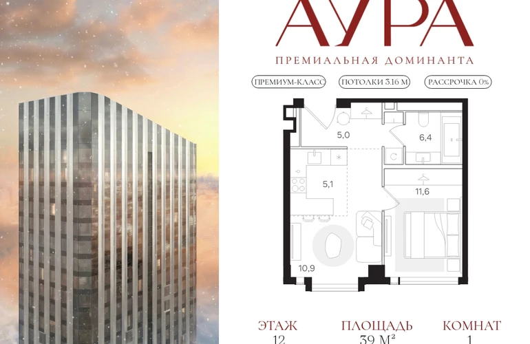 1-комнатная квартира площадью 39 м2. Высота потолков – 3,16 м. Этаж 12 из 41. Вид из окон - на город.О проекте
