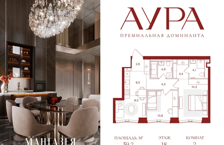 2-комнатная квартира площадью 59.20 м2. Высота потолков – 3.16 м. Этаж 18 из 42. Вид из окон - на город.О проекте АУРА новая премиальная доминанта Москвы в 10 минутах от Садового кольца. Проект состоит из 42-этажной Бронзовой башни и 41-этажной Серебряной. Рядом набережная Москвы-реки, Даниловский рынок, музеи и галереи, престижные школы и вузы.