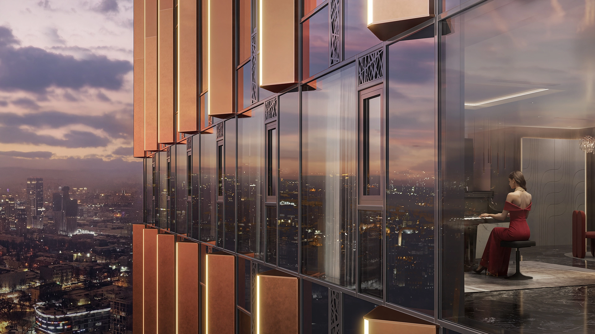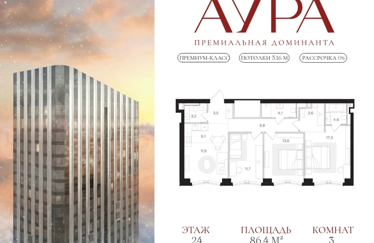 3-комнатная квартира площадью 86,4 м2. Высота потолков – 3,16 м. Этаж 24 из 42. Вид из окон - на город.О проекте