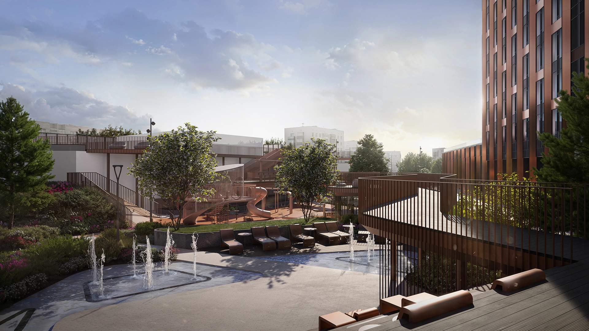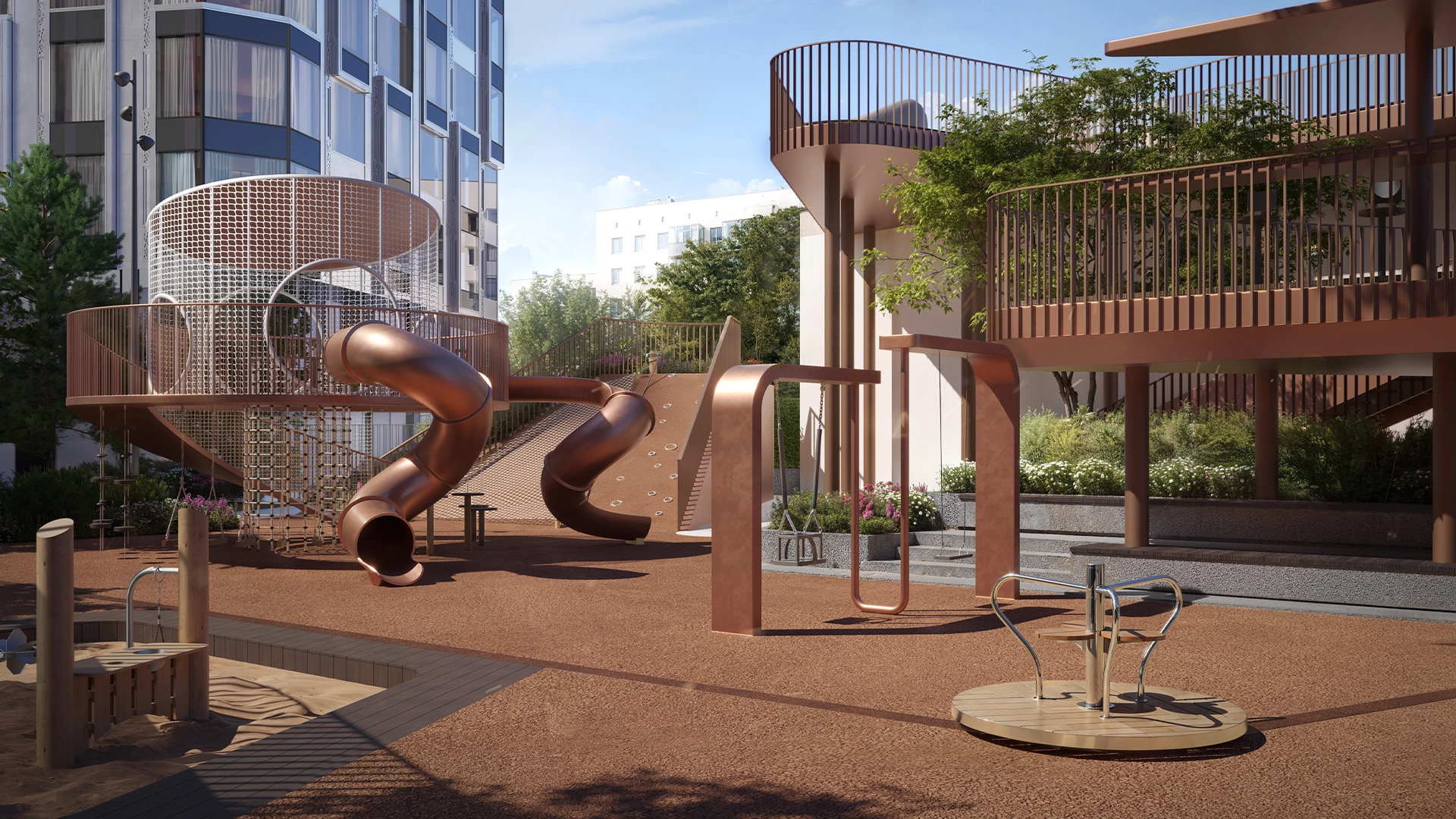 Приватная территория АУРЫ состоит из нескольких функциональных зон для тихого отдыха, работы и активного времяпровождения на свежем воздухе. На нижнем уровне расположены детские и спортивные площадки, скалодром и крытый павильон для подвижных игр. Выше — амфитеатр для отдыха и вечерних променадов, уличный коворкинг с мебелью и лаунж-зоны с лежаками у воды. На крыше — тихий уголок для занятий йогой, встречи рассветов и наслаждения закатами. По всему двору проложены пешеходные дорожки с подогревом в зимний сезон.