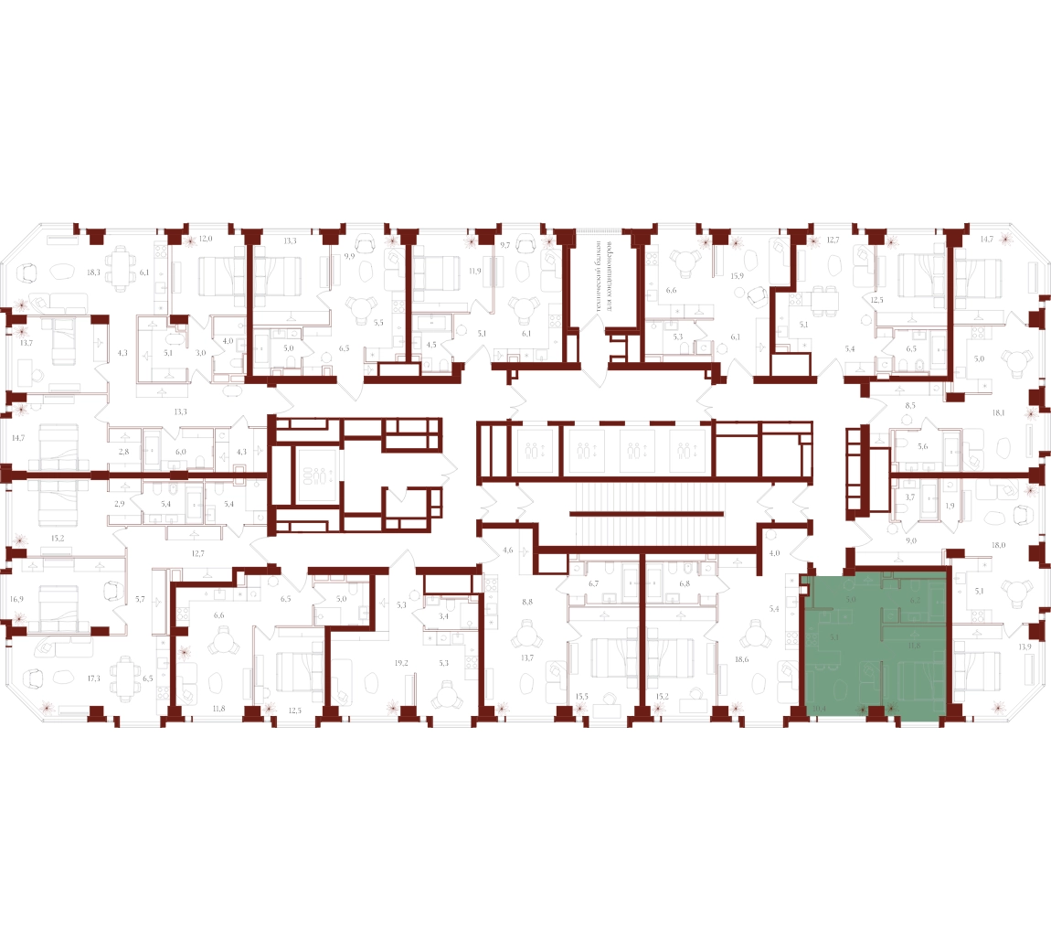• Индивидуальная вентиляция квартир • Вентиляция с очисткой воздуха в общих зонах • Мультизональное центральное кондиционирование (VRF) • Горячая вода круглый год • Вода качества, сопоставимого с питьевой • Усиленная звукоизоляция квартир