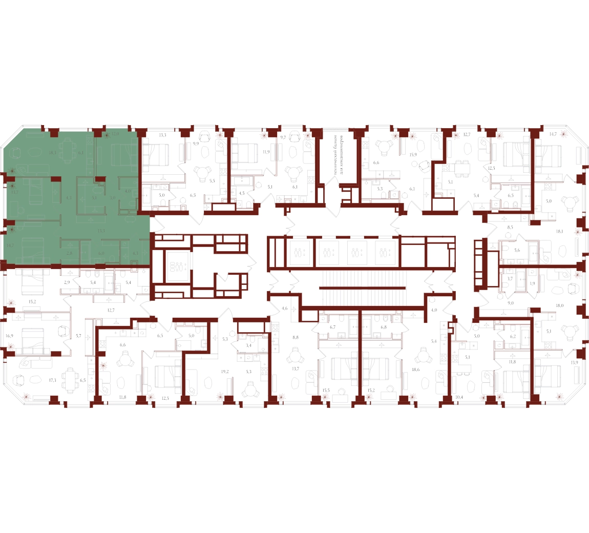 Только для резидентов: • Бьюти-комната • Коворкинг, переговорные и акустические кабинеты • Детская игровая комната • Спортзал и студия для тренировок • Просторные колясочные • Сервисная комната • Лапомойки для домашних питомцев