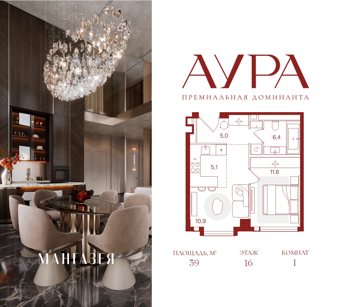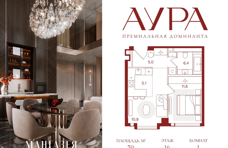 1-комнатная квартира площадью 39.00 м2. Высота потолков – 3.16 м. Этаж 16 из 41. Вид из окон - на город.О проекте АУРА новая премиальная доминанта Москвы в 10 минутах от Садового кольца. Проект состоит из 42-этажной Бронзовой башни и 41-этажной Серебряной. Рядом набережная Москвы-реки, Даниловский рынок, музеи и галереи, престижные школы и вузы.