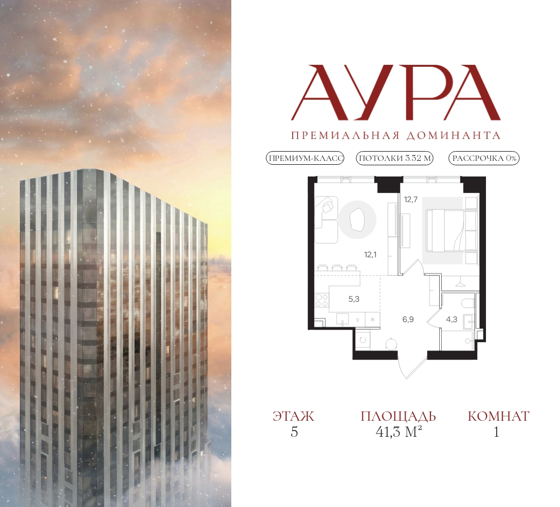 1-комнатная квартира площадью 41,3 м2. Высота потолков – 3,32 м. Этаж 5 из 42. Вид из окон - в свой двор.О проекте