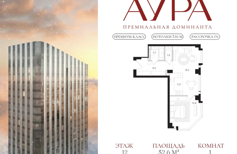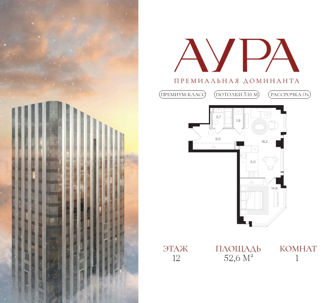 1-комнатная квартира площадью 52,6 м2. Высота потолков – 3,16 м. Этаж 12 из 41. Вид из окон - на две стороны света.О проекте