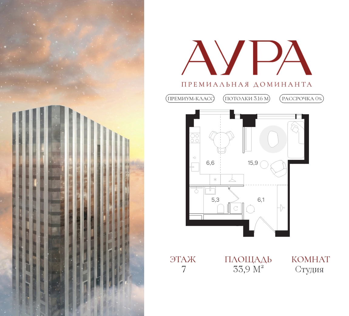 Студия площадью 33,9 м2. Высота потолков – 3,16 м. Этаж 7 из 41.О проекте