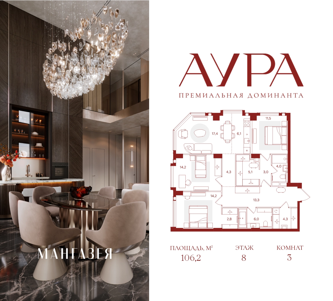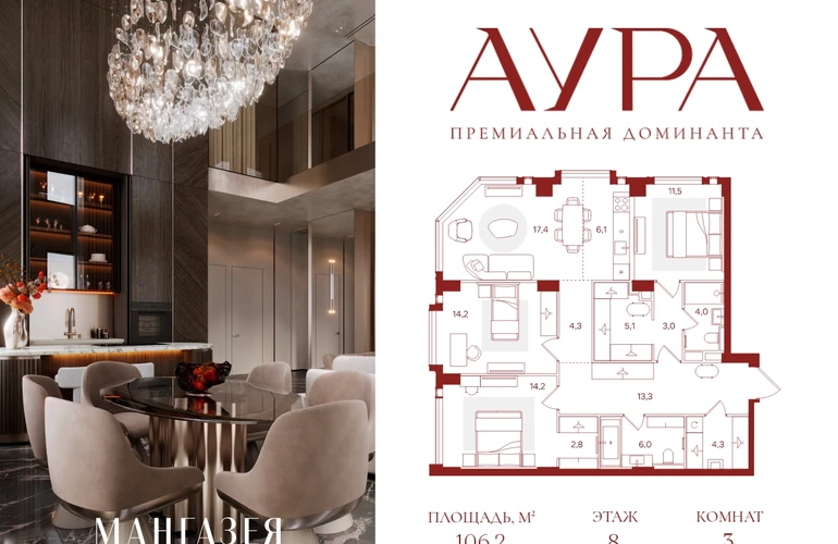 3-комнатная квартира площадью 106.20 м2. Высота потолков – 3.16 м. Этаж 8 из 41.О проекте АУРА новая премиальная доминанта Москвы в 10 минутах от Садового кольца. Проект состоит из 42-этажной Бронзовой башни и 41-этажной Серебряной. Рядом набережная Москвы-реки, Даниловский рынок, музеи и галереи, престижные школы и вузы.