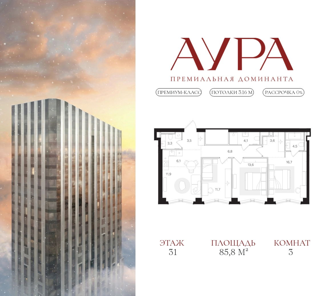 3-комнатная квартира площадью 85,8 м2. Высота потолков – 3,16 м. Этаж 31 из 42. Вид из окон - на город.О проекте
