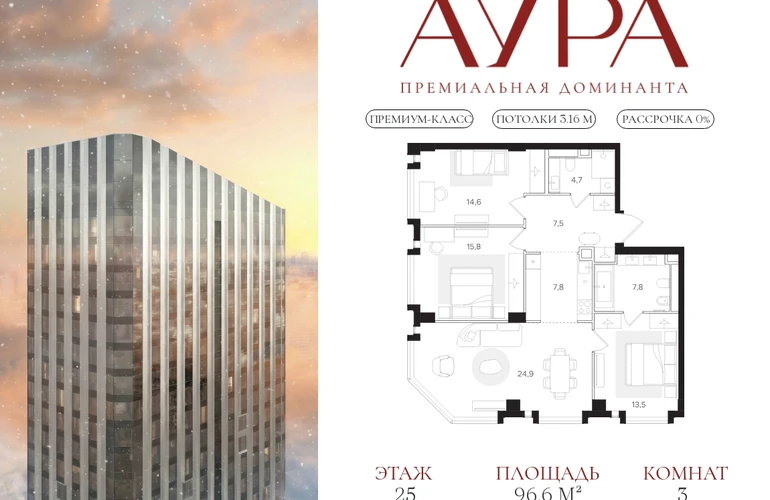 3-комнатная квартира площадью 96,6 м2. Высота потолков – 3,16 м. Этаж 25 из 41. Вид из окон - на две стороны света.О проекте