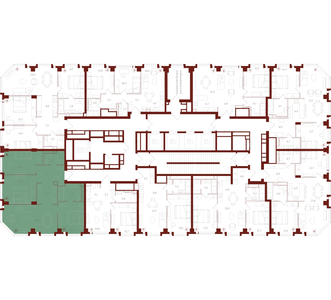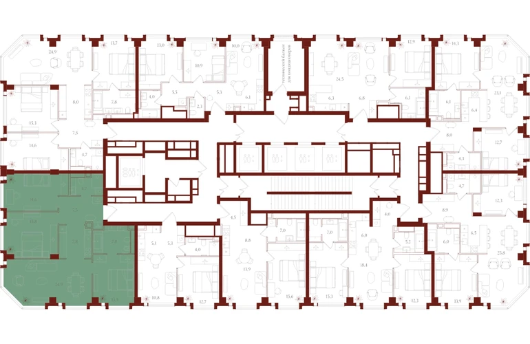 Только для резидентов: • Бьюти-комната • Коворкинг, переговорные и акустические кабинеты • Детская игровая комната • Спортзал и студия для тренировок • Просторные колясочные • Сервисная комната • Лапомойки для домашних питомцев