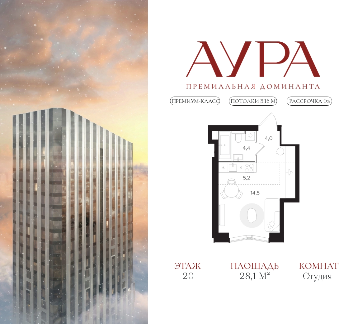 Студия площадью 28,1 м2. Высота потолков – 3,16 м. Этаж 20 из 42. Вид из окон - на город.О проекте