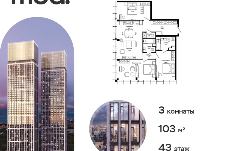 Прямая продажа от застройщика. Жилой комплекс премиум-класса Mod. Продается 3-к квартира общей площадью 103.10 кв. м без отделки в ЖК Mod на 43-м этаже 44 этажного дома. Mod - жилой комплекс премиум-класса в историческом районе Москвы Марьина Роща. Пятый корпус станет частью единого высотного ансамбля, который поднимается над столицей и очерчивает новый горизонт города. Расположение корпуса Mod.C отличается тем, что виды на юго-запад Москвы не ограничены существующей застройкой. Почти все главные доминанты столицы — как на ладони: от сталинских высоток до небоскрёбов делового центра. Любоваться достопримечательностями будет вдвойне приятнее через панорамные окна. Закрытая территория жилого комплекса, продуманное благоустройство, эксплуатируемые кровли стилобата, образовательный центр с детским садом создают приватное пространство для тихой семейной жизни, а городская площадь с фонтанами, ресторан, супермаркет, коммерческая инфраструктура на первых этажах привносят созвучную с ритмом города динамику. Преимущества проекта: • В шаговой доступности новый деловой кластер Москвы • Выразительная авторская архитектура • Единственные в Москве фасады башен из натурального камня • Панорамное остекление и высота потолков до 4,8 м • Квартиры и апартаменты с отделкой MR Base • Многоуровневое благоустройство с зонированием на закрытой территории • Многофункциональный образовательный детский центр с детским садом • Двухуровневый подземный паркинг Транспортная доступность: • 5 минут пешком до станции метро «Марьина роща» • 3 минуты до ТТК • 15 минут до Цветного бульвара Компания MR Group предлагает своим клиентам специальные условия приобретения квартир в рамках программ ипотечного кредитования от банков-партнеров.О застройщике