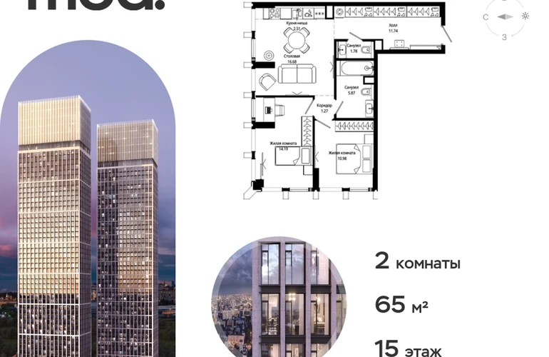 Прямая продажа от застройщика. Жилой комплекс премиум-класса Mod. Продается 2-к квартира общей площадью 65.10 кв. м с предчистовой отделкой в ЖК Mod на 15-м этаже 44 этажного дома. Mod - жилой комплекс премиум-класса в историческом районе Москвы Марьина Роща. Пятый корпус станет частью единого высотного ансамбля, который поднимается над столицей и очерчивает новый горизонт города. Расположение корпуса Mod.C отличается тем, что виды на юго-запад Москвы не ограничены существующей застройкой. Почти все главные доминанты столицы — как на ладони: от сталинских высоток до небоскрёбов делового центра. Любоваться достопримечательностями будет вдвойне приятнее через панорамные окна. Закрытая территория жилого комплекса, продуманное благоустройство, эксплуатируемые кровли стилобата, образовательный центр с детским садом создают приватное пространство для тихой семейной жизни, а городская площадь с фонтанами, ресторан, супермаркет, коммерческая инфраструктура на первых этажах привносят созвучную с ритмом города динамику. Преимущества проекта: • В шаговой доступности новый деловой кластер Москвы • Выразительная авторская архитектура • Единственные в Москве фасады башен из натурального камня • Панорамное остекление и высота потолков до 4,8 м • Квартиры и апартаменты с отделкой MR Base • Многоуровневое благоустройство с зонированием на закрытой территории • Многофункциональный образовательный детский центр с детским садом • Двухуровневый подземный паркинг Транспортная доступность: • 5 минут пешком до станции метро «Марьина роща» • 3 минуты до ТТК • 15 минут до Цветного бульвара Компания MR Group предлагает своим клиентам специальные условия приобретения квартир в рамках программ ипотечного кредитования от банков-партнеров.О застройщике