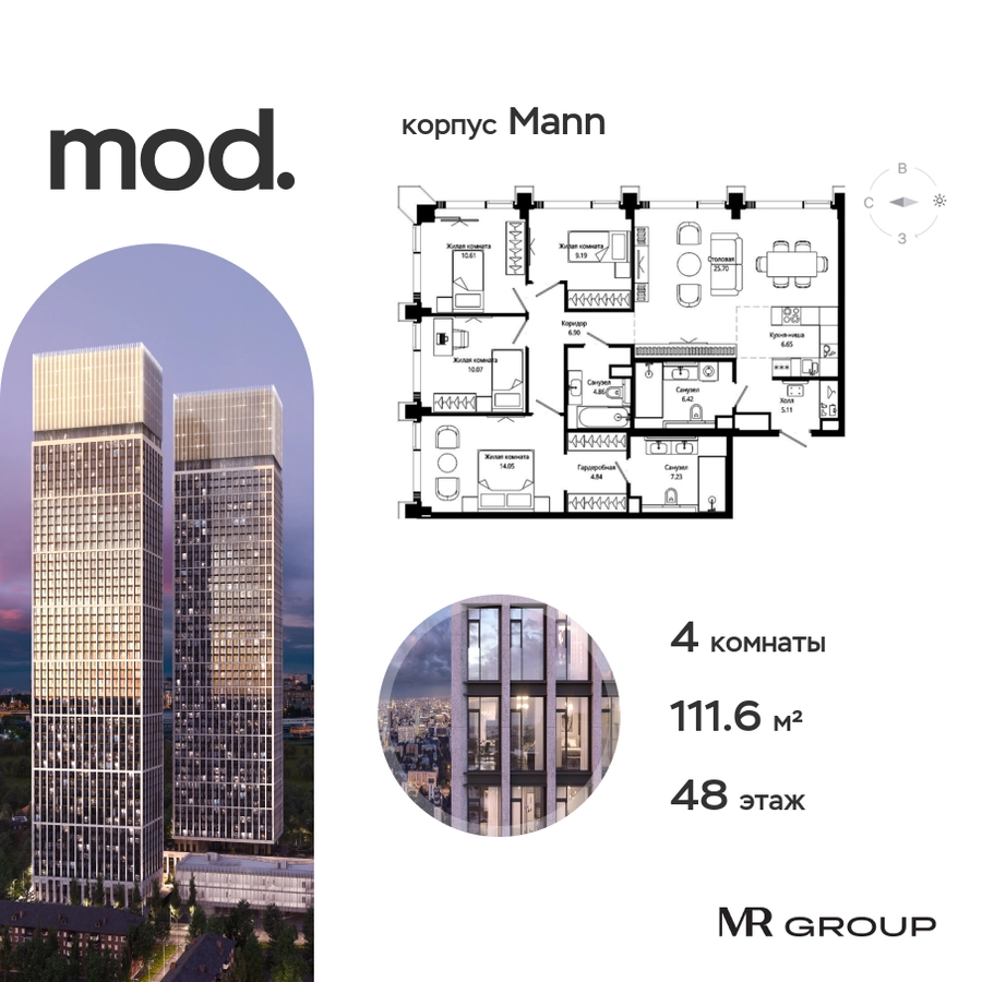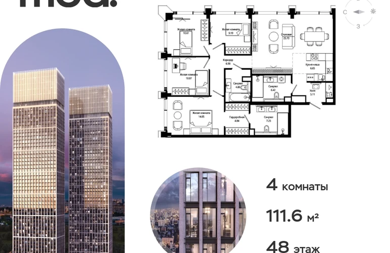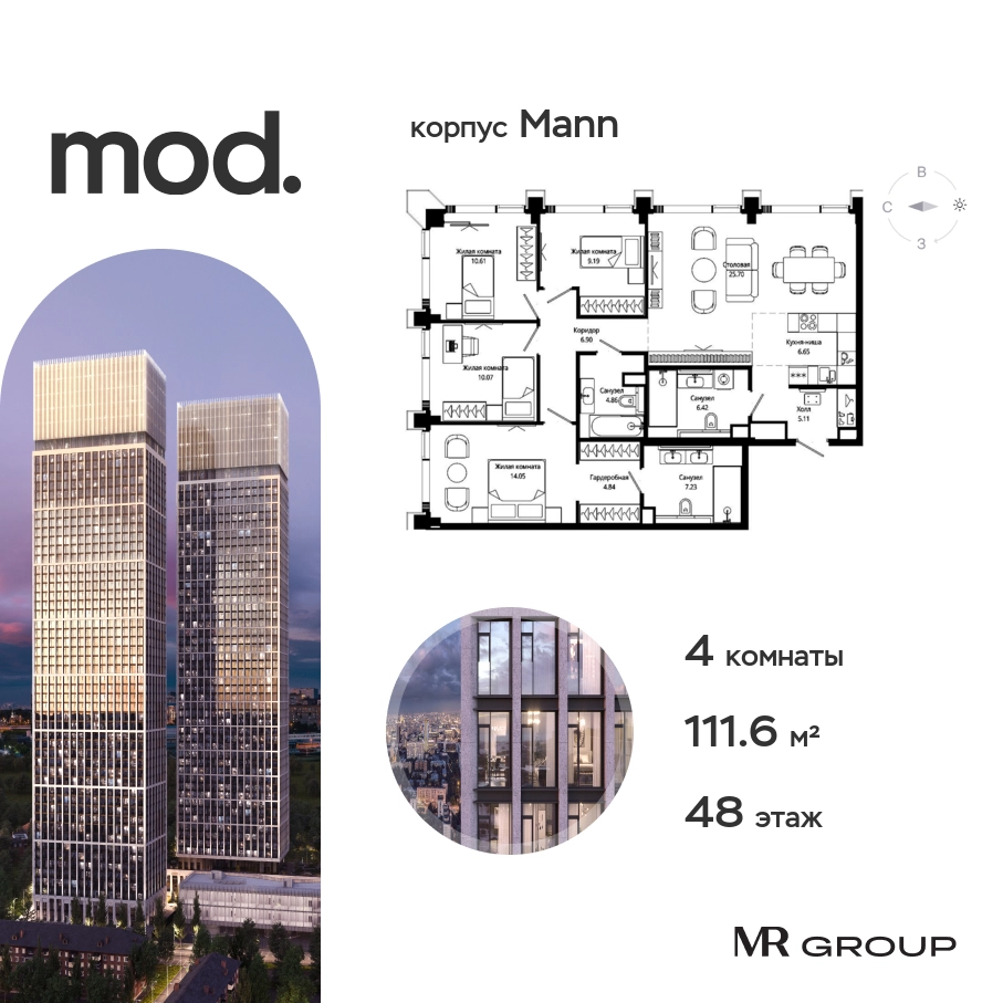 Прямая продажа от застройщика. Жилой комплекс премиум-класса Mod. Продается 4-к квартира общей площадью 115 кв. м с предчистовой отделкой в ЖК Mod на 48-м этаже 55 этажного дома. Mod - жилой комплекс премиум-класса в историческом районе Москвы Марьина Роща, состоящий из трех клубных домов (9 этажей) и трёх разноэтажных башен (44-55 этажей). Корпус Mod.M (55 этажей). Отделка фасадов выполнена из натурального гранита, что является уникальным архитектурным решением. Чёткие линии тонкой монолитной башни увенчаны светящейся янтарной «короной», выполненной из стекла и ламелей из анодированного алюминия с подсветкой. Закрытая территория жилого комплекса, продуманное благоустройство, эксплуатируемые кровли стилобата, образовательный центр с детским садом создают приватное пространство для тихой семейной жизни, а городская площадь с фонтанами, ресторан, супермаркет, коммерческая инфраструктура на первых этажах привносят созвучную с ритмом города динамику. Преимущества проекта: • В шаговой доступности новый деловой кластер Москвы • Выразительная авторская архитектура • Единственные в Москве фасады башен из натурального камня • Панорамное остекление и высота потолков до 4,8 м • Квартиры и апартаменты с отделкой MR Base • Многоуровневое благоустройство с зонированием на закрытой территории • Многофункциональный образовательный детский центр с детским садом • Двухуровневый подземный паркинг Транспортная доступность: • 5 минут пешком до станции метро «Марьина роща» • 3 минуты до ТТК • 15 минут до Цветного бульвара Компания MR Group предлагает своим клиентам специальные условия приобретения квартир в рамках программ ипотечного кредитования от банков-партнеров.О застройщике