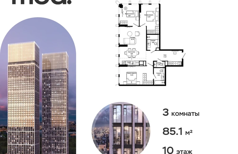 Прямая продажа от застройщика. Жилой комплекс премиум-класса Мод. Продается 3-к квартира общей площадью 85.50 кв. м с предчистовой отделкой в ЖК Мод на 10-м этаже 44 этажного дома. Мод - жилой комплекс премиум-класса в историческом районе Москвы Марьина Роща. Пятый корпус станет частью единого высотного ансамбля, который поднимается над столицей и очерчивает новый горизонт города. Расположение корпуса Мод.C отличается тем, что виды на юго-запад Москвы не ограничены существующей застройкой. Почти все главные доминанты столицы — как на ладони: от сталинских высоток до небоскрёбов делового центра. Любоваться достопримечательностями будет вдвойне приятнее через панорамные окна. Закрытая территория жилого комплекса, продуманное благоустройство, эксплуатируемые кровли стилобата, образовательный центр с детским садом создают приватное пространство для тихой семейной жизни, а городская площадь с фонтанами, ресторан, супермаркет, коммерческая инфраструктура на первых этажах привносят созвучную с ритмом города динамику. Преимущества проекта: • В шаговой доступности новый деловой кластер Москвы • Выразительная авторская архитектура • Единственные в Москве фасады башен из натурального камня • Панорамное остекление и высота потолков до 4,8 м • Квартиры и апартаменты с отделкой MR Base • Многоуровневое благоустройство с зонированием на закрытой территории • Многофункциональный образовательный детский центр с детским садом • Двухуровневый подземный паркинг Транспортная доступность: • 5 минут пешком до станции метро «Марьина роща» • 3 минуты до ТТК • 15 минут до Цветного бульвара Компания MR Group предлагает своим клиентам специальные условия приобретения квартир в рамках программ ипотечного кредитования от банков-партнеров.О застройщике