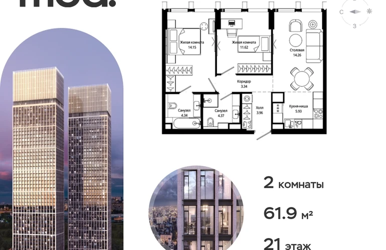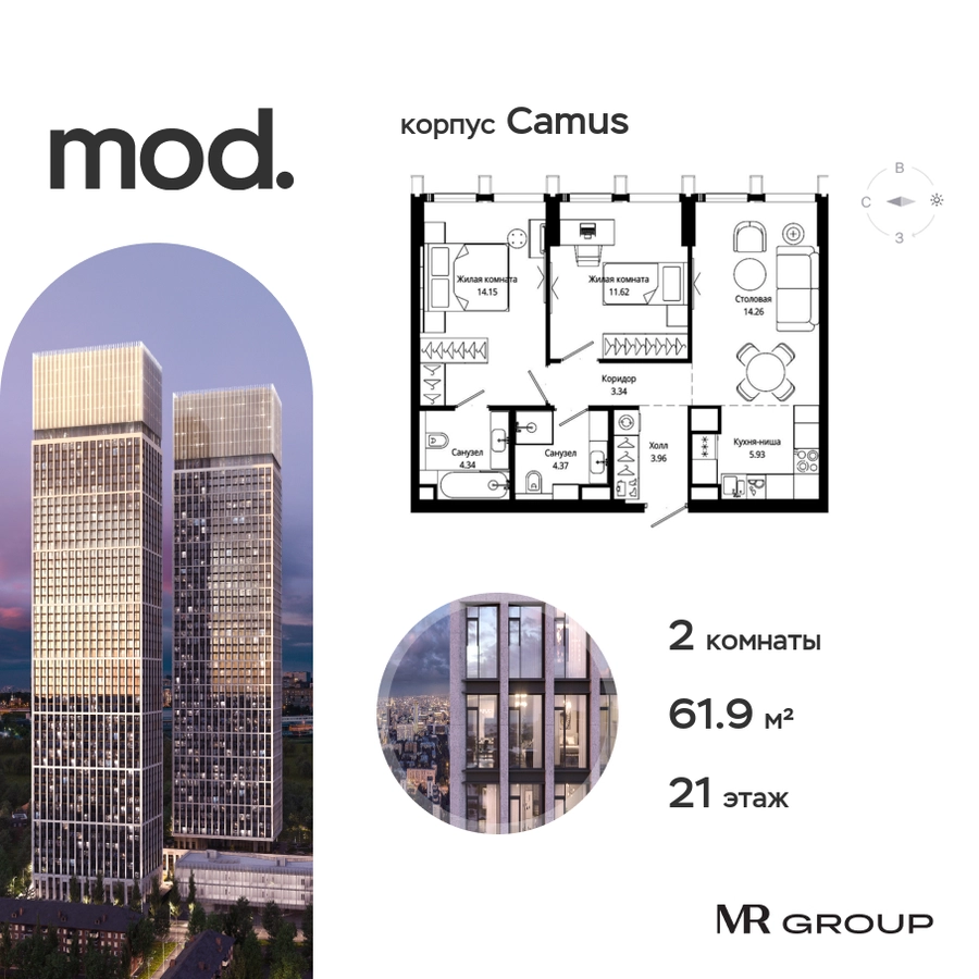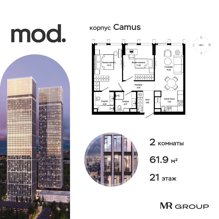 Прямая продажа от застройщика. Жилой комплекс премиум-класса Mod. Продается 2-к квартира общей площадью 62.30 кв. м с предчистовой отделкой в ЖК Mod на 21-м этаже 44 этажного дома. Mod - жилой комплекс премиум-класса в историческом районе Москвы Марьина Роща. Пятый корпус станет частью единого высотного ансамбля, который поднимается над столицей и очерчивает новый горизонт города. Расположение корпуса Mod.C отличается тем, что виды на юго-запад Москвы не ограничены существующей застройкой. Почти все главные доминанты столицы — как на ладони: от сталинских высоток до небоскрёбов делового центра. Любоваться достопримечательностями будет вдвойне приятнее через панорамные окна. Закрытая территория жилого комплекса, продуманное благоустройство, эксплуатируемые кровли стилобата, образовательный центр с детским садом создают приватное пространство для тихой семейной жизни, а городская площадь с фонтанами, ресторан, супермаркет, коммерческая инфраструктура на первых этажах привносят созвучную с ритмом города динамику. Преимущества проекта: • В шаговой доступности новый деловой кластер Москвы • Выразительная авторская архитектура • Единственные в Москве фасады башен из натурального камня • Панорамное остекление и высота потолков до 4,8 м • Квартиры и апартаменты с отделкой MR Base • Многоуровневое благоустройство с зонированием на закрытой территории • Многофункциональный образовательный детский центр с детским садом • Двухуровневый подземный паркинг Транспортная доступность: • 5 минут пешком до станции метро «Марьина роща» • 3 минуты до ТТК • 15 минут до Цветного бульвара Компания MR Group предлагает своим клиентам специальные условия приобретения квартир в рамках программ ипотечного кредитования от банков-партнеров.О застройщике