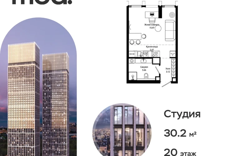 Прямая продажа от застройщика. Жилой комплекс премиум-класса Mod. Продается студия общей площадью 30.30 кв. м с предчистовой отделкой в ЖК Mod на 20-м этаже 44 этажного дома. Mod - жилой комплекс премиум-класса в историческом районе Москвы Марьина Роща. Пятый корпус станет частью единого высотного ансамбля, который поднимается над столицей и очерчивает новый горизонт города. Расположение корпуса Mod.C отличается тем, что виды на юго-запад Москвы не ограничены существующей застройкой. Почти все главные доминанты столицы — как на ладони: от сталинских высоток до небоскрёбов делового центра. Любоваться достопримечательностями будет вдвойне приятнее через панорамные окна. Закрытая территория жилого комплекса, продуманное благоустройство, эксплуатируемые кровли стилобата, образовательный центр с детским садом создают приватное пространство для тихой семейной жизни, а городская площадь с фонтанами, ресторан, супермаркет, коммерческая инфраструктура на первых этажах привносят созвучную с ритмом города динамику. Преимущества проекта: • В шаговой доступности новый деловой кластер Москвы • Выразительная авторская архитектура • Единственные в Москве фасады башен из натурального камня • Панорамное остекление и высота потолков до 4,8 м • Квартиры и апартаменты с отделкой MR Base • Многоуровневое благоустройство с зонированием на закрытой территории • Многофункциональный образовательный детский центр с детским садом • Двухуровневый подземный паркинг Транспортная доступность: • 5 минут пешком до станции метро «Марьина роща» • 3 минуты до ТТК • 15 минут до Цветного бульвара Компания MR Group предлагает своим клиентам специальные условия приобретения квартир в рамках программ ипотечного кредитования от банков-партнеров.О застройщике
