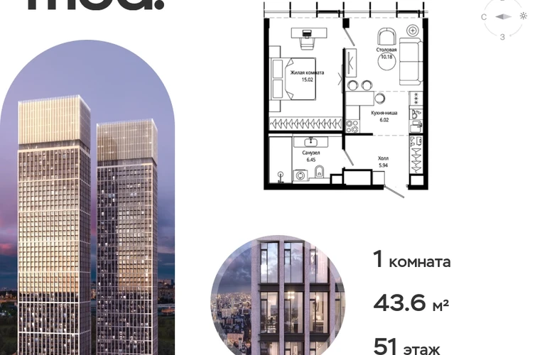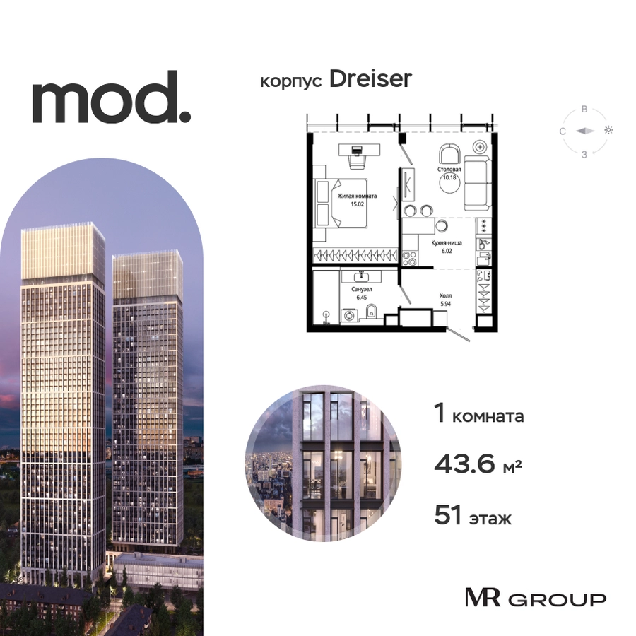 Прямая продажа от застройщика. Жилой комплекс премиум-класса Mod. Продается 1-к квартира общей площадью 43.90 кв. м без отделки в ЖК Mod на 51-м этаже 55 этажного дома. Mod - жилой комплекс премиум-класса в историческом районе Москвы Марьина Роща, состоящий из трех клубных домов (9 этажей) и трёх разноэтажных башен (44-55 этажей). Корпус Mod.D (55 этажей) назван именем знаменитого писателя модерниста Теодора Драйзера. 6 верхних этажей занимают пентхаусы с высотой потолков до 4,8 м. Отделка фасадов выполнена из натурального гранита, что является уникальным архитектурным решением. Чёткие линии тонкой монолитной башни увенчаны светящейся янтарной «короной», выполненной из стекла и ламелей из анодированного алюминия с подсветкой. Закрытая территория жилого комплекса, продуманное благоустройство, эксплуатируемые кровли стилобата, образовательный центр с детским садом создают приватное пространство для тихой семейной жизни, а городская площадь с фонтанами, ресторан, супермаркет, коммерческая инфраструктура на первых этажах привносят созвучную с ритмом города динамику. Преимущества проекта: • В шаговой доступности новый деловой кластер Москвы • Выразительная авторская архитектура • Единственные в Москве фасады башен из натурального камня • Панорамное остекление и высота потолков до 4,8 м • Квартиры и апартаменты с отделкой MR Base • Многоуровневое благоустройство с зонированием на закрытой территории • Многофункциональный образовательный детский центр с детским садом • Двухуровневый подземный паркинг Транспортная доступность: • 5 минут пешком до станции метро «Марьина роща» • 3 минуты до ТТК • 15 минут до Цветного бульвара Компания MR Group предлагает своим клиентам специальные условия приобретения квартир в рамках программ ипотечного кредитования от банков-партнеров.О застройщике