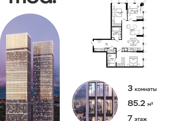 Прямая продажа от застройщика. Жилой комплекс премиум-класса Mod. Продается 3-к квартира общей площадью 85.40 кв. м с предчистовой отделкой в ЖК Mod на 7-м этаже 44 этажного дома. Mod - жилой комплекс премиум-класса в историческом районе Москвы Марьина Роща. Пятый корпус станет частью единого высотного ансамбля, который поднимается над столицей и очерчивает новый горизонт города. Расположение корпуса Mod.C отличается тем, что виды на юго-запад Москвы не ограничены существующей застройкой. Почти все главные доминанты столицы — как на ладони: от сталинских высоток до небоскрёбов делового центра. Любоваться достопримечательностями будет вдвойне приятнее через панорамные окна. Закрытая территория жилого комплекса, продуманное благоустройство, эксплуатируемые кровли стилобата, образовательный центр с детским садом создают приватное пространство для тихой семейной жизни, а городская площадь с фонтанами, ресторан, супермаркет, коммерческая инфраструктура на первых этажах привносят созвучную с ритмом города динамику. Преимущества проекта: • В шаговой доступности новый деловой кластер Москвы • Выразительная авторская архитектура • Единственные в Москве фасады башен из натурального камня • Панорамное остекление и высота потолков до 4,8 м • Квартиры и апартаменты с отделкой MR Base • Многоуровневое благоустройство с зонированием на закрытой территории • Многофункциональный образовательный детский центр с детским садом • Двухуровневый подземный паркинг Транспортная доступность: • 5 минут пешком до станции метро «Марьина роща» • 3 минуты до ТТК • 15 минут до Цветного бульвара Компания MR Group предлагает своим клиентам специальные условия приобретения квартир в рамках программ ипотечного кредитования от банков-партнеров.О застройщике