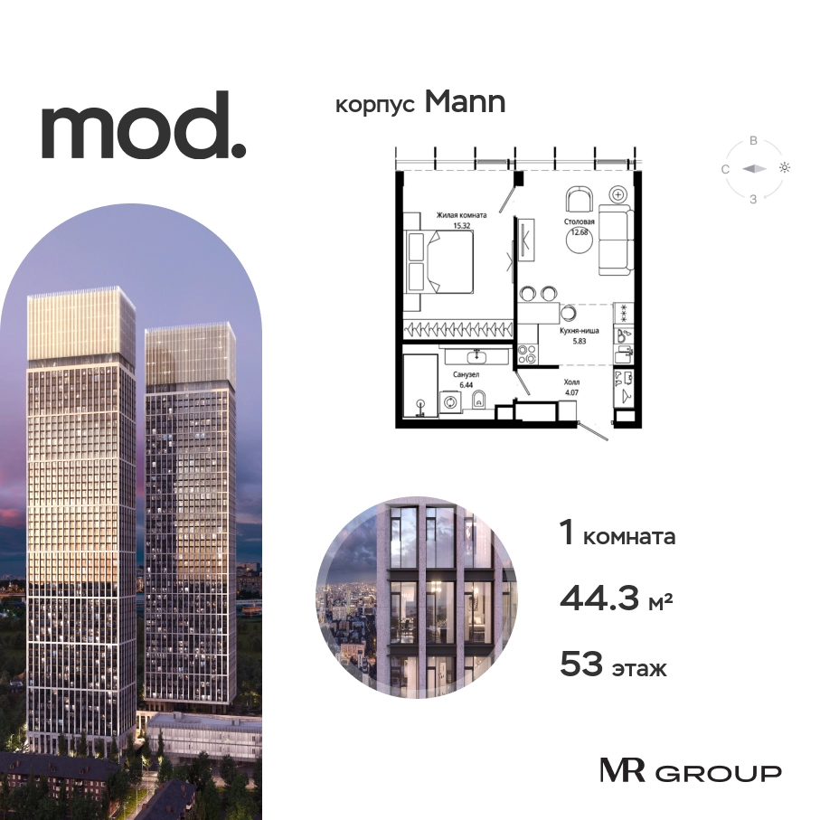 Прямая продажа от застройщика. Жилой комплекс премиум-класса Mod. Продается 1-к квартира общей площадью 44.10 кв. м без отделки в ЖК Mod на 53-м этаже 55 этажного дома. Mod - жилой комплекс премиум-класса в историческом районе Москвы Марьина Роща, состоящий из трех клубных домов (9 этажей) и трёх разноэтажных башен (44-55 этажей). Корпус Mod.M (55 этажей). Отделка фасадов выполнена из натурального гранита, что является уникальным архитектурным решением. Чёткие линии тонкой монолитной башни увенчаны светящейся янтарной «короной», выполненной из стекла и ламелей из анодированного алюминия с подсветкой. Закрытая территория жилого комплекса, продуманное благоустройство, эксплуатируемые кровли стилобата, образовательный центр с детским садом создают приватное пространство для тихой семейной жизни, а городская площадь с фонтанами, ресторан, супермаркет, коммерческая инфраструктура на первых этажах привносят созвучную с ритмом города динамику. Преимущества проекта: • В шаговой доступности новый деловой кластер Москвы • Выразительная авторская архитектура • Единственные в Москве фасады башен из натурального камня • Панорамное остекление и высота потолков до 4,8 м • Квартиры и апартаменты с отделкой MR Base • Многоуровневое благоустройство с зонированием на закрытой территории • Многофункциональный образовательный детский центр с детским садом • Двухуровневый подземный паркинг Транспортная доступность: • 5 минут пешком до станции метро «Марьина роща» • 3 минуты до ТТК • 15 минут до Цветного бульвара Компания MR Group предлагает своим клиентам специальные условия приобретения квартир в рамках программ ипотечного кредитования от банков-партнеров.О застройщике