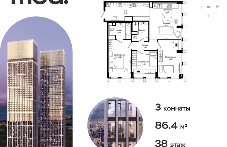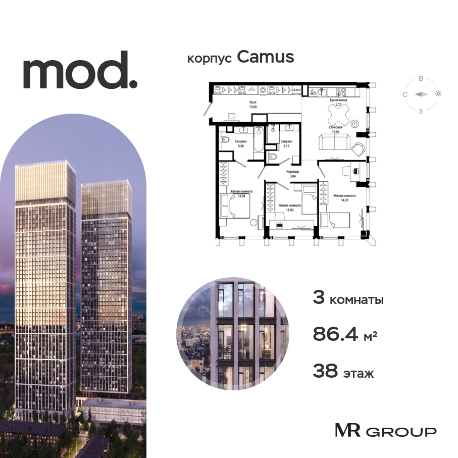 Прямая продажа от застройщика. Жилой комплекс премиум-класса Mod. Продается 3-к квартира общей площадью 86.50 кв. м с предчистовой отделкой в ЖК Mod на 38-м этаже 44 этажного дома. Mod - жилой комплекс премиум-класса в историческом районе Москвы Марьина Роща. Пятый корпус станет частью единого высотного ансамбля, который поднимается над столицей и очерчивает новый горизонт города. Расположение корпуса Mod.C отличается тем, что виды на юго-запад Москвы не ограничены существующей застройкой. Почти все главные доминанты столицы — как на ладони: от сталинских высоток до небоскрёбов делового центра. Любоваться достопримечательностями будет вдвойне приятнее через панорамные окна. Закрытая территория жилого комплекса, продуманное благоустройство, эксплуатируемые кровли стилобата, образовательный центр с детским садом создают приватное пространство для тихой семейной жизни, а городская площадь с фонтанами, ресторан, супермаркет, коммерческая инфраструктура на первых этажах привносят созвучную с ритмом города динамику. Преимущества проекта: • В шаговой доступности новый деловой кластер Москвы • Выразительная авторская архитектура • Единственные в Москве фасады башен из натурального камня • Панорамное остекление и высота потолков до 4,8 м • Квартиры и апартаменты с отделкой MR Base • Многоуровневое благоустройство с зонированием на закрытой территории • Многофункциональный образовательный детский центр с детским садом • Двухуровневый подземный паркинг Транспортная доступность: • 5 минут пешком до станции метро «Марьина роща» • 3 минуты до ТТК • 15 минут до Цветного бульвара Компания MR Group предлагает своим клиентам специальные условия приобретения квартир в рамках программ ипотечного кредитования от банков-партнеров.О застройщике