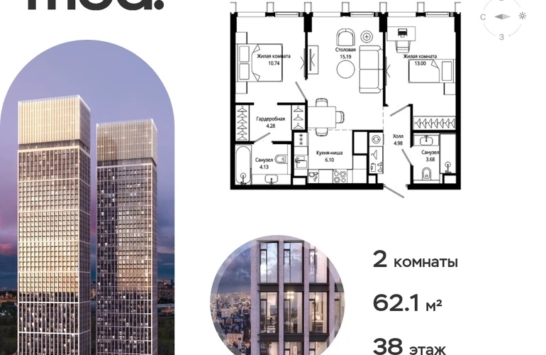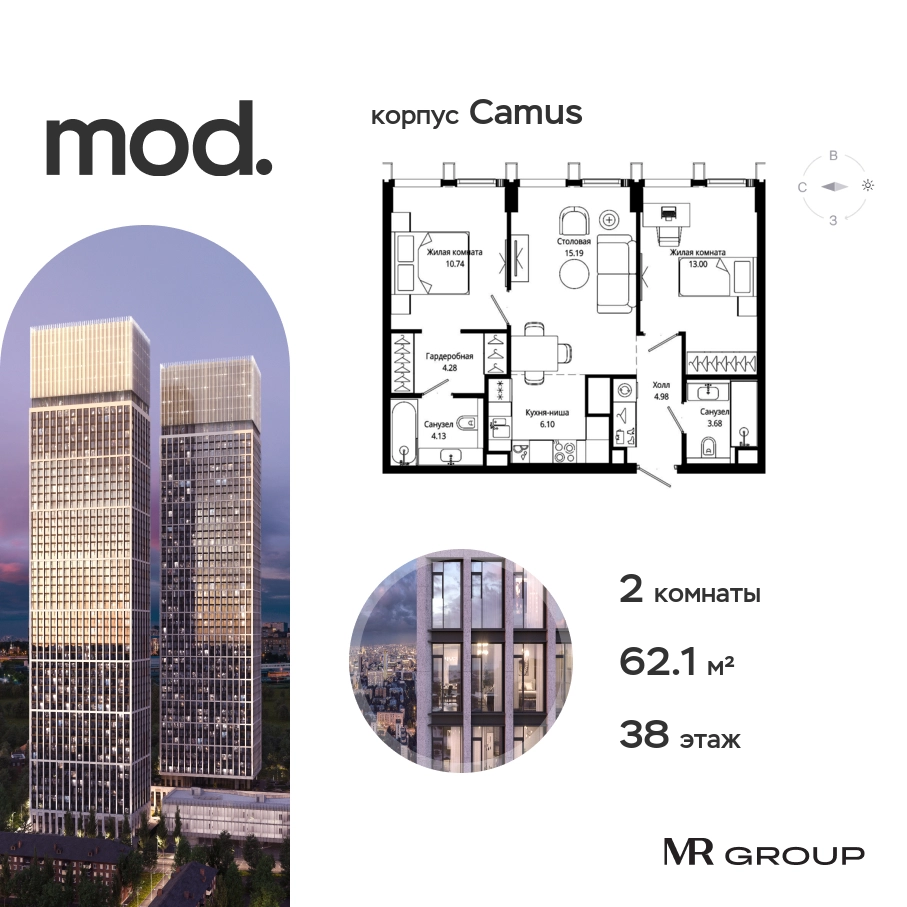 Прямая продажа от застройщика. Жилой комплекс премиум-класса Мод. Продается 2-к квартира общей площадью 62.40 кв. м с предчистовой отделкой в ЖК Мод на 38-м этаже 44 этажного дома. Мод - жилой комплекс премиум-класса в историческом районе Москвы Марьина Роща. Пятый корпус станет частью единого высотного ансамбля, который поднимается над столицей и очерчивает новый горизонт города. Расположение корпуса Мод.C отличается тем, что виды на юго-запад Москвы не ограничены существующей застройкой. Почти все главные доминанты столицы — как на ладони: от сталинских высоток до небоскрёбов делового центра. Любоваться достопримечательностями будет вдвойне приятнее через панорамные окна. Закрытая территория жилого комплекса, продуманное благоустройство, эксплуатируемые кровли стилобата, образовательный центр с детским садом создают приватное пространство для тихой семейной жизни, а городская площадь с фонтанами, ресторан, супермаркет, коммерческая инфраструктура на первых этажах привносят созвучную с ритмом города динамику. Преимущества проекта: • В шаговой доступности новый деловой кластер Москвы • Выразительная авторская архитектура • Единственные в Москве фасады башен из натурального камня • Панорамное остекление и высота потолков до 4,8 м • Квартиры и апартаменты с отделкой MR Base • Многоуровневое благоустройство с зонированием на закрытой территории • Многофункциональный образовательный детский центр с детским садом • Двухуровневый подземный паркинг Транспортная доступность: • 5 минут пешком до станции метро «Марьина роща» • 3 минуты до ТТК • 15 минут до Цветного бульвара Компания MR Group предлагает своим клиентам специальные условия приобретения квартир в рамках программ ипотечного кредитования от банков-партнеров.О застройщике