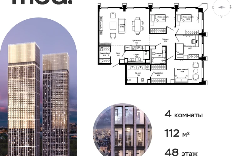 Прямая продажа от застройщика. Жилой комплекс премиум-класса Mod. Продается 4-к квартира общей площадью 114.70 кв. м с предчистовой отделкой в ЖК Mod на 48-м этаже 55 этажного дома. Mod - жилой комплекс премиум-класса в историческом районе Москвы Марьина Роща, состоящий из трех клубных домов (9 этажей) и трёх разноэтажных башен (44-55 этажей). Корпус Mod.D (55 этажей) назван именем знаменитого писателя модерниста Теодора Драйзера. 6 верхних этажей занимают пентхаусы с высотой потолков до 4,8 м. Отделка фасадов выполнена из натурального гранита, что является уникальным архитектурным решением. Чёткие линии тонкой монолитной башни увенчаны светящейся янтарной «короной», выполненной из стекла и ламелей из анодированного алюминия с подсветкой. Закрытая территория жилого комплекса, продуманное благоустройство, эксплуатируемые кровли стилобата, образовательный центр с детским садом создают приватное пространство для тихой семейной жизни, а городская площадь с фонтанами, ресторан, супермаркет, коммерческая инфраструктура на первых этажах привносят созвучную с ритмом города динамику. Преимущества проекта: • В шаговой доступности новый деловой кластер Москвы • Выразительная авторская архитектура • Единственные в Москве фасады башен из натурального камня • Панорамное остекление и высота потолков до 4,8 м • Квартиры и апартаменты с отделкой MR Base • Многоуровневое благоустройство с зонированием на закрытой территории • Многофункциональный образовательный детский центр с детским садом • Двухуровневый подземный паркинг Транспортная доступность: • 5 минут пешком до станции метро «Марьина роща» • 3 минуты до ТТК • 15 минут до Цветного бульвара Компания MR Group предлагает своим клиентам специальные условия приобретения квартир в рамках программ ипотечного кредитования от банков-партнеров.О застройщике