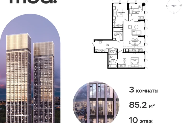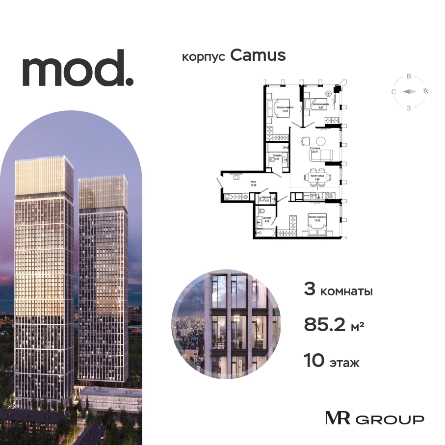 Прямая продажа от застройщика. Жилой комплекс премиум-класса Mod. Продается 3-к квартира общей площадью 85.10 кв. м с предчистовой отделкой в ЖК Mod на 10-м этаже 44 этажного дома. Mod - жилой комплекс премиум-класса в историческом районе Москвы Марьина Роща. Пятый корпус станет частью единого высотного ансамбля, который поднимается над столицей и очерчивает новый горизонт города. Расположение корпуса Mod.C отличается тем, что виды на юго-запад Москвы не ограничены существующей застройкой. Почти все главные доминанты столицы — как на ладони: от сталинских высоток до небоскрёбов делового центра. Любоваться достопримечательностями будет вдвойне приятнее через панорамные окна. Закрытая территория жилого комплекса, продуманное благоустройство, эксплуатируемые кровли стилобата, образовательный центр с детским садом создают приватное пространство для тихой семейной жизни, а городская площадь с фонтанами, ресторан, супермаркет, коммерческая инфраструктура на первых этажах привносят созвучную с ритмом города динамику. Преимущества проекта: • В шаговой доступности новый деловой кластер Москвы • Выразительная авторская архитектура • Единственные в Москве фасады башен из натурального камня • Панорамное остекление и высота потолков до 4,8 м • Квартиры и апартаменты с отделкой MR Base • Многоуровневое благоустройство с зонированием на закрытой территории • Многофункциональный образовательный детский центр с детским садом • Двухуровневый подземный паркинг Транспортная доступность: • 5 минут пешком до станции метро «Марьина роща» • 3 минуты до ТТК • 15 минут до Цветного бульвара Компания MR Group предлагает своим клиентам специальные условия приобретения квартир в рамках программ ипотечного кредитования от банков-партнеров.О застройщике