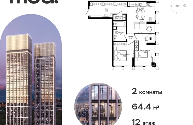 Прямая продажа от застройщика. Жилой комплекс премиум-класса Мод. Продается 2-к квартира общей площадью 64.80 кв. м с предчистовой отделкой в ЖК Мод на 12-м этаже 44 этажного дома. Мод - жилой комплекс премиум-класса в историческом районе Москвы Марьина Роща. Пятый корпус станет частью единого высотного ансамбля, который поднимается над столицей и очерчивает новый горизонт города. Расположение корпуса Мод.C отличается тем, что виды на юго-запад Москвы не ограничены существующей застройкой. Почти все главные доминанты столицы — как на ладони: от сталинских высоток до небоскрёбов делового центра. Любоваться достопримечательностями будет вдвойне приятнее через панорамные окна. Закрытая территория жилого комплекса, продуманное благоустройство, эксплуатируемые кровли стилобата, образовательный центр с детским садом создают приватное пространство для тихой семейной жизни, а городская площадь с фонтанами, ресторан, супермаркет, коммерческая инфраструктура на первых этажах привносят созвучную с ритмом города динамику. Преимущества проекта: • В шаговой доступности новый деловой кластер Москвы • Выразительная авторская архитектура • Единственные в Москве фасады башен из натурального камня • Панорамное остекление и высота потолков до 4,8 м • Квартиры и апартаменты с отделкой MR Base • Многоуровневое благоустройство с зонированием на закрытой территории • Многофункциональный образовательный детский центр с детским садом • Двухуровневый подземный паркинг Транспортная доступность: • 5 минут пешком до станции метро «Марьина роща» • 3 минуты до ТТК • 15 минут до Цветного бульвара Компания MR Group предлагает своим клиентам специальные условия приобретения квартир в рамках программ ипотечного кредитования от банков-партнеров.О застройщике
