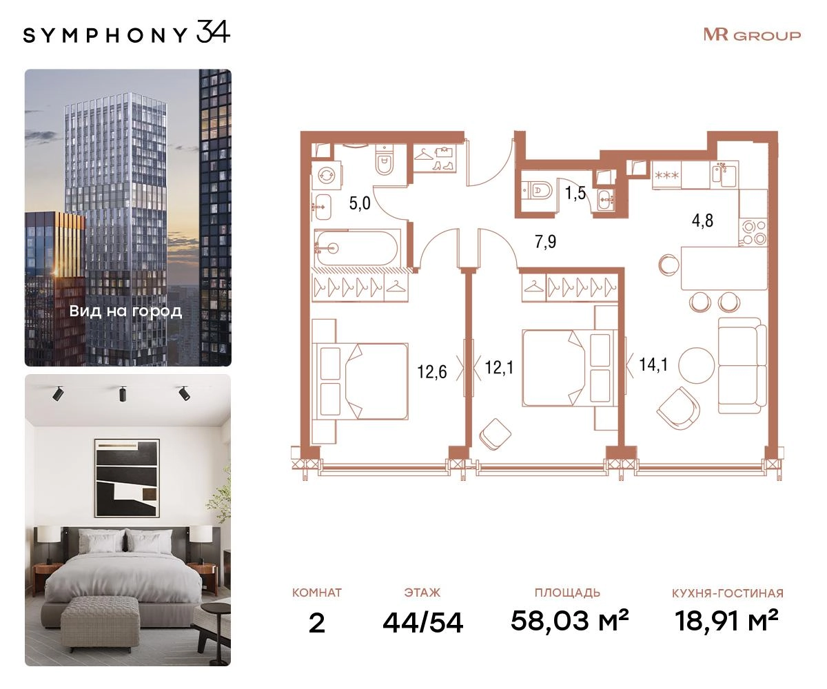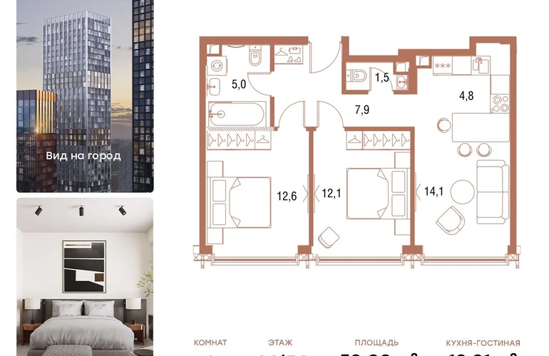 В продаже 2-комнатная квартира площадью 57,6 кв.м. с отделкой MR Base на 44-м этаже 54 этажного дома.