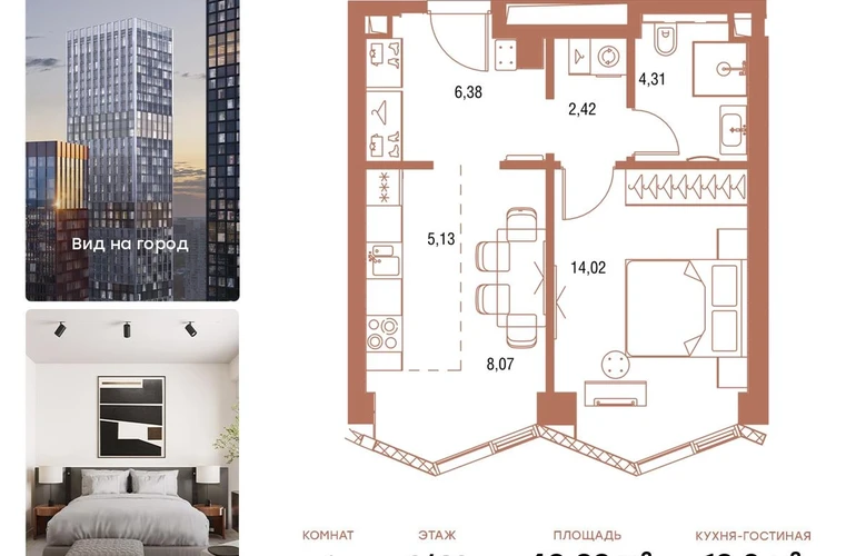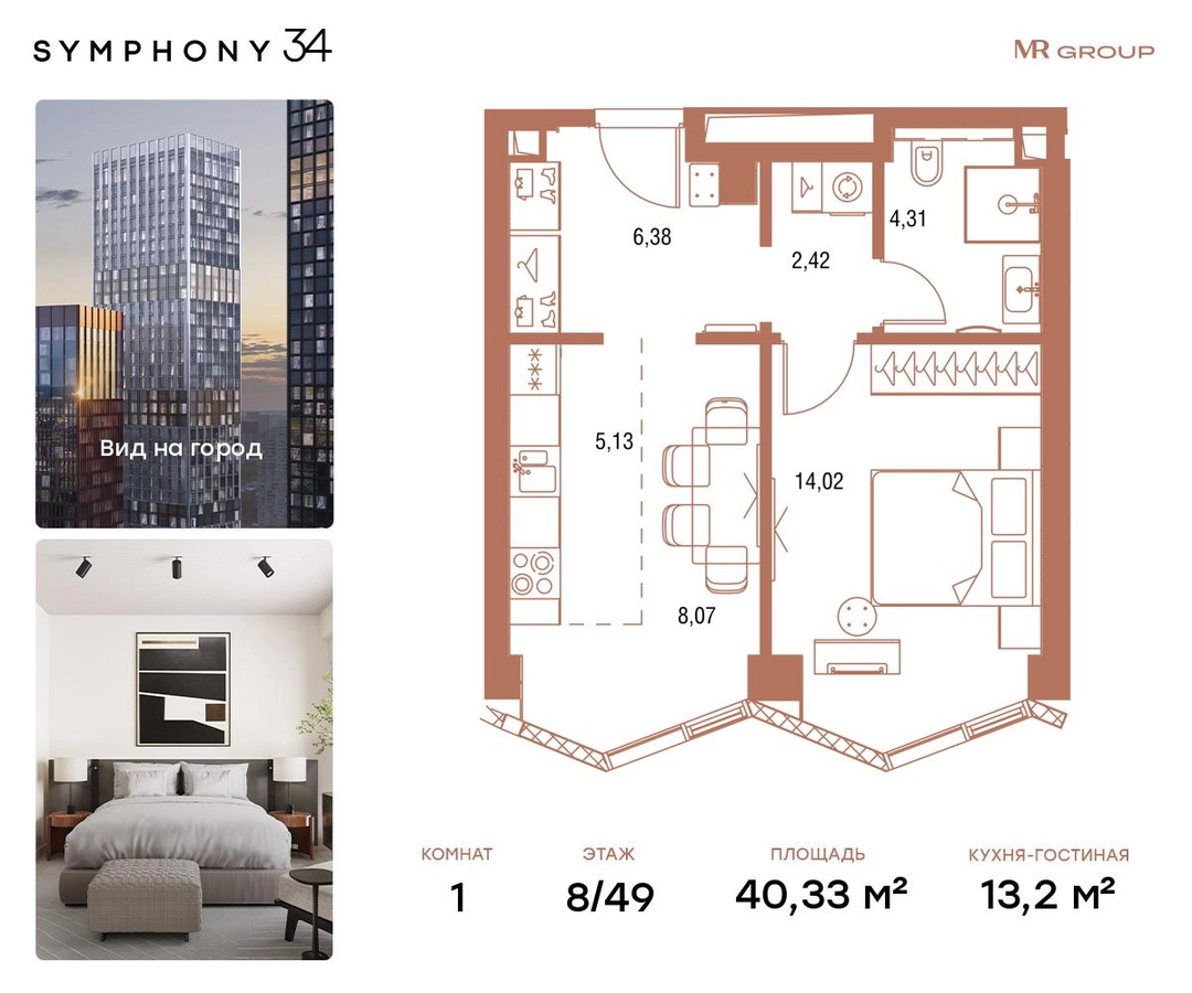 В продаже 1-комнатная квартира площадью 40,8 кв.м. с отделкой MR Base на 8-м этаже 49 этажного дома.