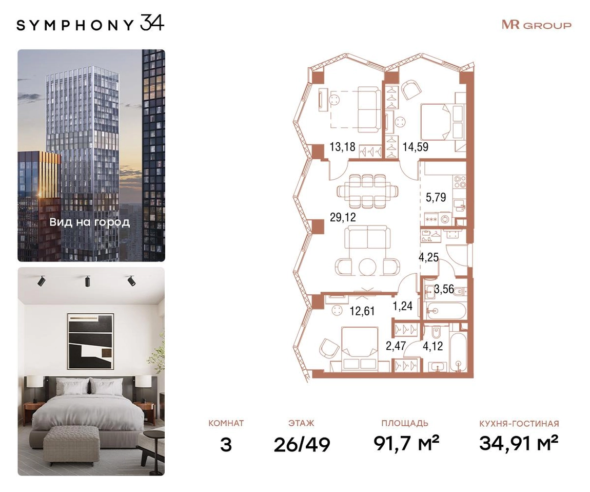 В продаже 3-комнатная квартира площадью 91,7 кв.м. с отделкой MR Base на 26-м этаже 49 этажного дома.