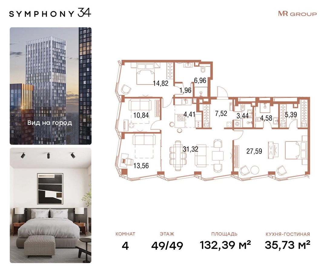 В продаже 4-комнатная квартира площадью 132,6 кв.м. с отделкой MR Base на 49-м этаже 49 этажного дома.