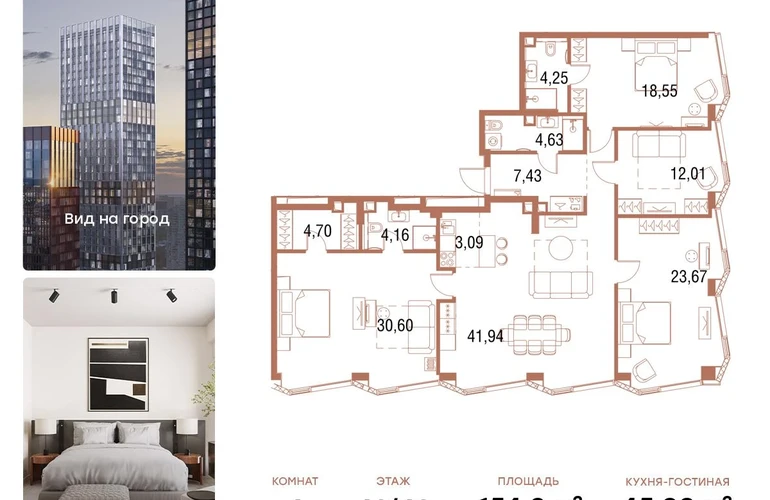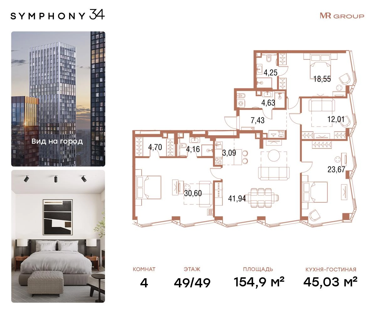 В продаже 4-комнатная квартира площадью 154,9 кв.м. с отделкой MR Base на 49-м этаже 49 этажного дома.