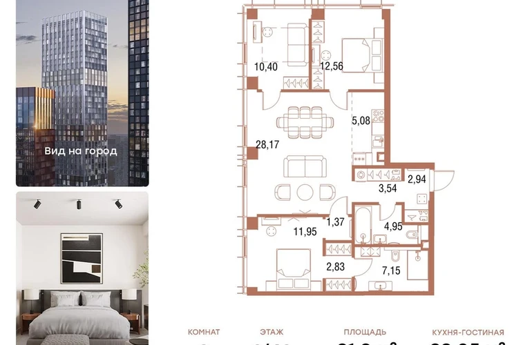 В продаже 3-комнатная квартира площадью 91,9 кв.м. с отделкой MR Base на 3-м этаже 43 этажного дома.