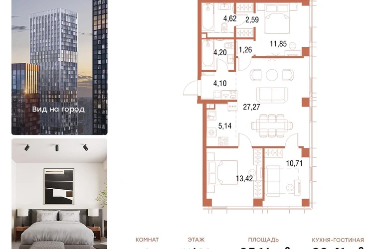 В продаже 3-комнатная квартира площадью 86,2 кв.м. с отделкой MR Base на 11-м этаже 43 этажного дома.