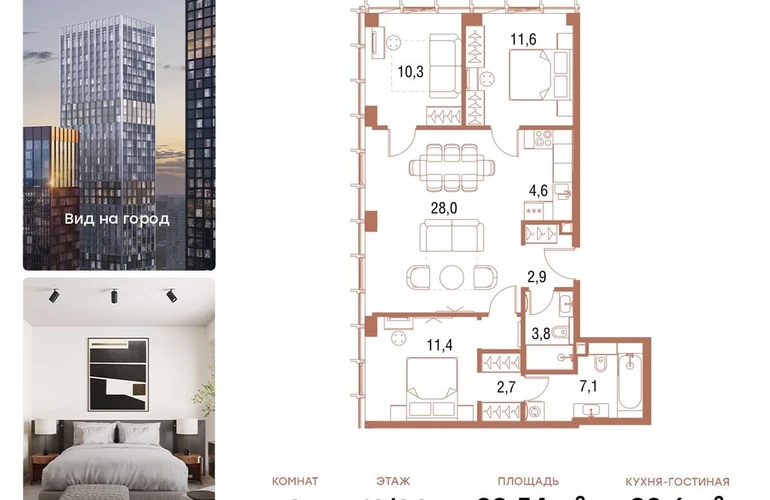 В продаже 3-комнатная квартира площадью 83,9 кв.м. с отделкой MR Ready на 13-м этаже 36 этажного дома.