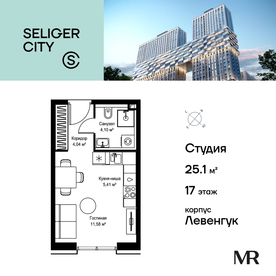 Прямая продажа от застройщика. Продаётся студия общей площадью 25.13 кв. м без отделки в ЖК «Селигер Сити» на 17-м этаже 21 этажного дома. Селигер Сити — это уютное пространство, где предусмотрена застройка разной этажности, чтобы каждый покупатель мог выбрать то, что ему по душе: невысокие дома или небоскребы, с верхних этажей которых будут открываться отличные виды на город. Преимущества проекта: Первые три очереди сданы. • 2 минуты пешком от метро «Селигерская» • Архитектурное решение от голландского бюро MLA + • 8 корпусов разной этажности от 8 до 45 этажей • Одна из самых больших придомовых территорий в Москве — размером с 4 футбольных поля • Огороженная охраняемая территория, круглосуточное видеонаблюдение • Европейский подход к благоустройству от бюро WOWHaus: детские площадки для разных возрастов, спортивные площадки, площадки воркаута, дорожки для бега и пеших прогулок, скейтпарк, хоккейная площадка, площадка для выгула собак • Искусственный пруд на территории комплекса с благоустроенной набережной и мостом • Продуманная концепция инфраструктуры: уютные кафе и рестораны, супермаркет, магазин фермерских продуктов, бытовые службы, салон красоты, детские сады • Панорамные окна высотой до 2,5 м, в корпусах 3 очереди витражное остекление высотой до 4,2 м • Широкий выбор квартир — от компактных студий до просторных квартир с тремя спальнями и пентхаусов • Четыре вида дизайнерской отделки квартир от бюро Вlank Architects • Возможность купить квартиру с предчистовой отделкой white box • «Умный дом» на платформе Ujin. Система безопасности, вход на территорию и в подъезд по биометрии или BLE-метке, въезд в паркинг по считывателю номера, контроль климата. Все для комфортной жизни! • Лобби по индивидуальному дизайн проекту от европейского бюро Вlank Architects: лаунж-зоны, ресепшен, колясочная, помещение для мытья лап животным после прогулки • Подземный паркинг на 2189 машино-мест по индивидуальному дизайну, с зарядными устройствами для электромобилей, постами для подкачки шин и келлерами • Надежный девелопер с опытом премиальных проектов MR Group Расположение комплекса: • 2 минуты от станции метро «Селигерская» • 7 минут на машине до станции метро «Окружная» • Предусмотрен удобный выезд в сторону ТТК (всего 9 км или 15 минут без пробок) • МКАД в 10 минутах на машине Компания MR Group предлагает своим клиентам специальные условия приобретения квартир в рамках программ ипотечного кредитования от банков-партнеров.О застройщике