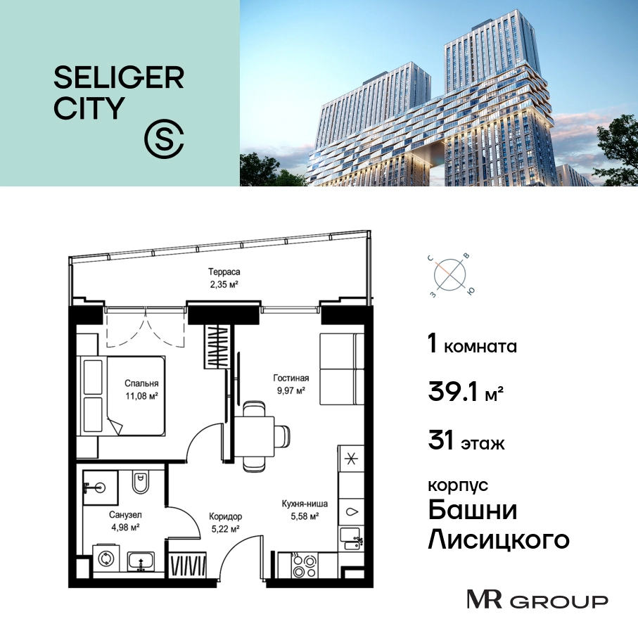 Прямая продажа от застройщика. Продаётся 1-к квартира общей площадью 39.18 кв. м без отделки в ЖК «Селигер Сити» на 31-м этаже башни Лисицкого. Корпуса четвертой очереди ЖК «Селигер сити» названы в честь трех великих представителей науки и архитектуры, новаторское видение которых — слишком смелое для своего времени — нашло воплощение в уникальных домах жилого комплекса. Вдохновленные авангардными идеями знаменитого советского архитектора Эля Лисицкого, архитекторы создали яркий центр притяжения всего района, задающий новый стандарт жизни в современном мегаполисе — две высокие «Башни Лисицкого» с современной интерпретацией горизонтального небоскреба. Преимущества проекта: Первые три очереди сданы. • 2 минуты пешком от метро «Селигерская» • Архитектурное решение от голландского бюро MLA + • 8 корпусов разной этажности от 8 до 45 этажей • Одна из самых больших придомовых территорий в Москве — размером с 4 футбольных поля • Огороженная охраняемая территория, круглосуточное видеонаблюдение • Европейский подход к благоустройству от бюро WOWHaus: детские площадки для разных возрастов, спортивные площадки, площадки воркаута, дорожки для бега и пеших прогулок, скейтпарк, хоккейная площадка, площадка для выгула собак • Искусственный пруд на территории комплекса с благоустроенной набережной и мостом • Продуманная концепция инфраструктуры: уютные кафе и рестораны, супермаркет, магазин фермерских продуктов, бытовые службы, салон красоты, детские сады • Панорамные окна высотой до 2,5 м, в корпусах 3 очереди витражное остекление высотой до 4,2 м • Широкий выбор квартир — от компактных студий до просторных квартир с тремя спальнями и пентхаусов • Четыре вида дизайнерской отделки квартир от бюро Вlank Architects • Возможность купить квартиру с предчистовой отделкой white box • «Умный дом» на платформе Ujin. Система безопасности, вход на территорию и в подъезд по биометрии или BLE-метке, въезд в паркинг по считывателю номера, контроль климата. Все для комфортной жизни! • Лобби по индивидуальному дизайн проекту от европейского бюро Вlank Architects: лаунж-зоны, ресепшен, колясочная, помещение для мытья лап животным после прогулки • Подземный паркинг на 2189 машино-мест по индивидуальному дизайну, с зарядными устройствами для электромобилей, постами для подкачки шин и келлерами • Надежный девелопер с опытом премиальных проектов MR Group Расположение комплекса: • 2 минуты от станции метро «Селигерская» • 7 минут на машине до станции метро «Окружная» • Предусмотрен удобный выезд в сторону ТТК (всего 9 км или 15 минут без пробок) • МКАД в 10 минутах на машине Компания MR Group предлагает своим клиентам специальные условия приобретения квартир в рамках программ ипотечного кредитования от банков-партнеров.О застройщике