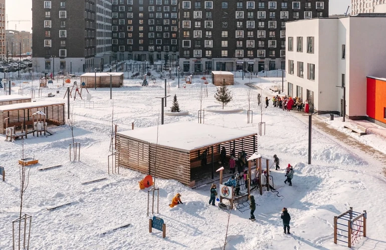 Через квартал протянется широкий пешеходный бульвар для прогулок и отдыха. Уже открыт PlayHub «Гравити» — большая игровая площадка для детей разного возраста с лазательным комплексом, песочной станцией и зонами отдыха для родителей. На первых этажах домов работают магазины, кафе и полезные сервисы. А на парковке установлены зарядные станции для электрокаров.