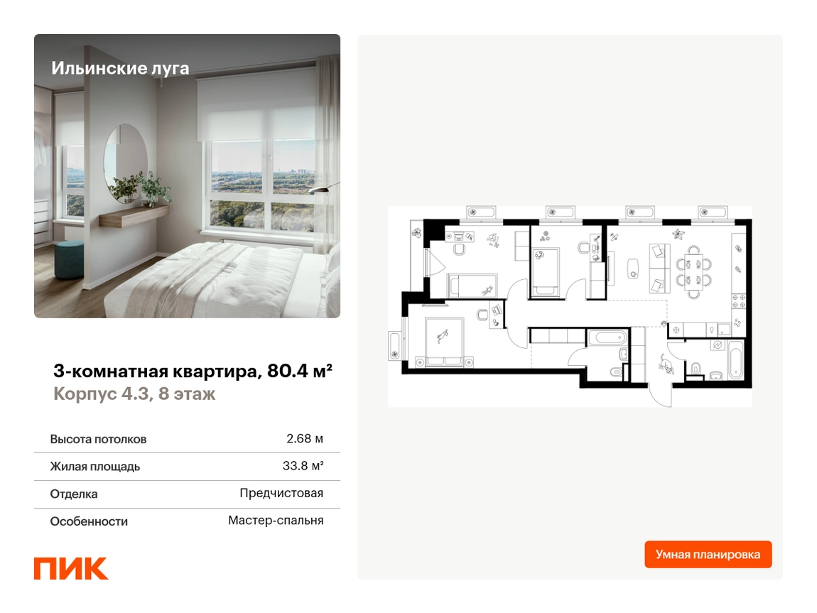 В Красногорске Московской области продаётся 3-комнатная квартира квартира площадью 80.4 на 8 этаже 9 этажного дома (корпус 4.3, секция 5) в проекте ПИК «Ильинские луга». Удобное расположение 20 минут на автомобиле до станций метро «Волоколамская», «Тушинская» и «Строгино». 20 минут на машине до МЦД «Павшино». 5 минут на автомобиле до ТЦ «РИГАМОЛЛ» и 10 минут до ТЦ «Твой дом» и гипермаркета «Глобус». 10 минут на автомобиле до музея-заповедника Архангельское. Особенности проекта «Ильинские луга» — масштабный проект с собственной инфраструктурой и атмосферой загородной жизни. Удобные и разнообразные планировки позволят каждому выбрать квартиру под собственный сценарий жизни. Преимущества проекта: Отделка: Предчистовая Особенности планировки: Гардеробная, Мастер-спальня, Кухня-гостиная, Два и более санузла, Открытый балкон, Умная планировка Светлые и просторные холлы с быстрыми тихими лифтами. Девять детских садов, четыре школы и современная поликлиника на территории проекта. Дворы-парки с местами для отдыха, детскими и спортивными площадками. Пешеходный бульвар для прогулок и отдыха. PlayHub «Гравити» — большая игровая площадка для детей. Магазины, кафе и полезные сервисы на первых этажах домов. Наземный паркинг с зарядными станциями для электрокаров. АртикулО застройщике
