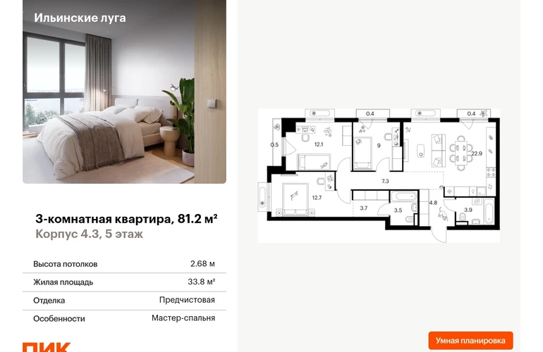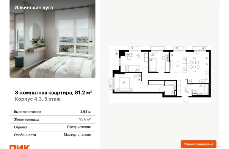 В Красногорске Московской области продаётся 3-комнатная квартира квартира площадью 81.2 на 5 этаже 9 этажного дома (корпус 4.3, секция 5) в проекте ПИК «Ильинские луга». Удобное расположение 20 минут на автомобиле до станций метро «Волоколамская», «Тушинская» и «Строгино». 20 минут на машине до МЦД «Павшино». 5 минут на автомобиле до ТЦ «РИГАМОЛЛ» и 10 минут до ТЦ «Твой дом» и гипермаркета «Глобус». 10 минут на автомобиле до музея-заповедника Архангельское. Особенности проекта «Ильинские луга» — масштабный проект с собственной инфраструктурой и атмосферой загородной жизни. Удобные и разнообразные планировки позволят каждому выбрать квартиру под собственный сценарий жизни. Преимущества проекта: Отделка: Предчистовая Особенности планировки: Гардеробная, Мастер-спальня, Кухня-гостиная, Два и более санузла, Открытый балкон, Умная планировка Светлые и просторные холлы с быстрыми тихими лифтами. Девять детских садов, четыре школы и современная поликлиника на территории проекта. Дворы-парки с местами для отдыха, детскими и спортивными площадками. Пешеходный бульвар для прогулок и отдыха. PlayHub «Гравити» — большая игровая площадка для детей. Магазины, кафе и полезные сервисы на первых этажах домов. Наземный паркинг с зарядными станциями для электрокаров. АртикулО застройщике