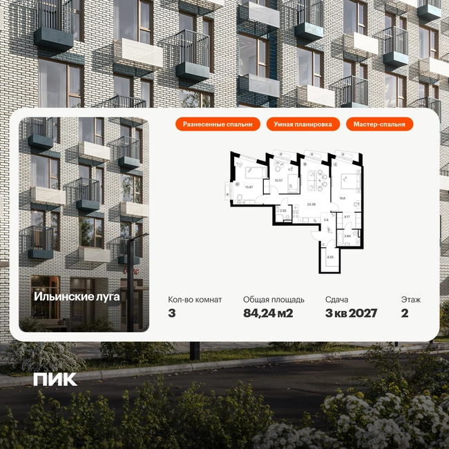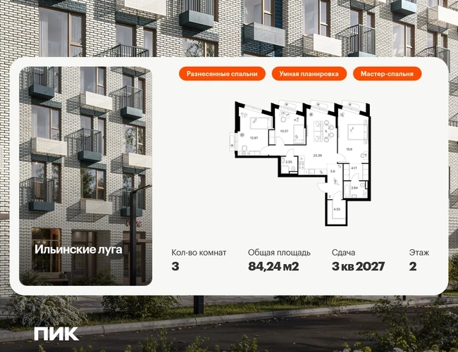 В Красногорске Московской области продаётся 3-комнатная квартира квартира площадью 84.24 на 2 этаже 9 этажного дома (корпус 4.2, секция 5) в проекте ПИК «Ильинские луга». Удобное расположение 20 минут на автомобиле до станций метро «Волоколамская», «Тушинская» и «Строгино». 20 минут на машине до МЦД «Павшино». 5 минут на автомобиле до ТЦ «РИГАМОЛЛ» и 10 минут до ТЦ «Твой дом» и гипермаркета «Глобус». 10 минут на автомобиле до музея-заповедника Архангельское. Особенности проекта «Ильинские луга» — масштабный проект с собственной инфраструктурой и атмосферой загородной жизни. Удобные и разнообразные планировки позволят каждому выбрать квартиру под собственный сценарий жизни. Преимущества проекта: Отделка: Предчистовая Особенности планировки: Гардеробная, Мастер-спальня, Разнесенные спальни, Кухня-гостиная, Два и более санузла, Умная планировка Светлые и просторные холлы с быстрыми тихими лифтами. Девять детских садов, четыре школы и современная поликлиника на территории проекта. Дворы-парки с местами для отдыха, детскими и спортивными площадками. Пешеходный бульвар для прогулок и отдыха. PlayHub «Гравити» — большая игровая площадка для детей. Магазины, кафе и полезные сервисы на первых этажах домов. Наземный паркинг с зарядными станциями для электрокаров. АртикулО застройщике
