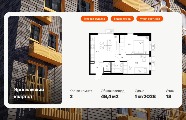 Продаётся 2-комн.квартира площадью 49.40 кв.м на 18 этаже 25 этажного дома (Корпус 2.4, секция 1) проекта ПИК Ярославский квартал. Светлый просторный подъезд на уровне земли, функциональная планировка, большие окна, с отделкой. Проект «Ярославский квартал» возводится в Мытищах, в 6 км от МКАД. Жилой квартал, состоящий из 8 корпусов, строится рядом с Ярославским шоссе и имеет удобный заезд с крупной автомагистрали. На территории проекта появится школа, детский сад и пешеходный бульвар. Индивидуальные дизайны фасадов для «Ярославского квартала» разработало петербургское архитектурное бюро RHIZOME. В их портфолио вошли работы для Московского музея современного искусства, ГЦСИ, Манифеста 10 и ЦВЗ Манеж. За 7 минут можно дойти пешком до ближайшей автобусной остановки. Столько же займёт дорога до «Лосиного острова» — облагороженного парка с разными активностями для всей семьи, благоустроенными зонами для отдыха, местами для прогулок и пробежек на свежем воздухе. Доехать на автомобиле до Ярославского шоссе получится за 3 минуты, до станции «Мытищи» — за 9 минут, до МКАД — за 15 минут. Артикул - 1013557О застройщике