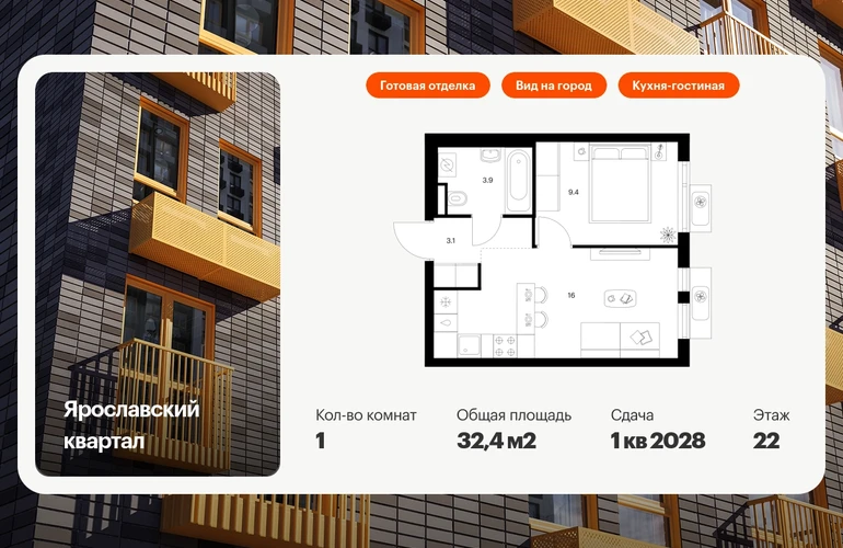 Продаётся 1-комн.квартира площадью 32.40 кв.м на 22 этаже 25 этажного дома (Корпус 2.4, секция 1) проекта ПИК Ярославский квартал. Светлый просторный подъезд на уровне земли, функциональная планировка, большие окна, с отделкой. Проект «Ярославский квартал» возводится в Мытищах, в 6 км от МКАД. Жилой квартал, состоящий из 8 корпусов, строится рядом с Ярославским шоссе и имеет удобный заезд с крупной автомагистрали. На территории проекта появится школа, детский сад и пешеходный бульвар. Индивидуальные дизайны фасадов для «Ярославского квартала» разработало петербургское архитектурное бюро RHIZOME. В их портфолио вошли работы для Московского музея современного искусства, ГЦСИ, Манифеста 10 и ЦВЗ Манеж. За 7 минут можно дойти пешком до ближайшей автобусной остановки. Столько же займёт дорога до «Лосиного острова» — облагороженного парка с разными активностями для всей семьи, благоустроенными зонами для отдыха, местами для прогулок и пробежек на свежем воздухе. Доехать на автомобиле до Ярославского шоссе получится за 3 минуты, до станции «Мытищи» — за 9 минут, до МКАД — за 15 минут. Артикул - 1013612О застройщике