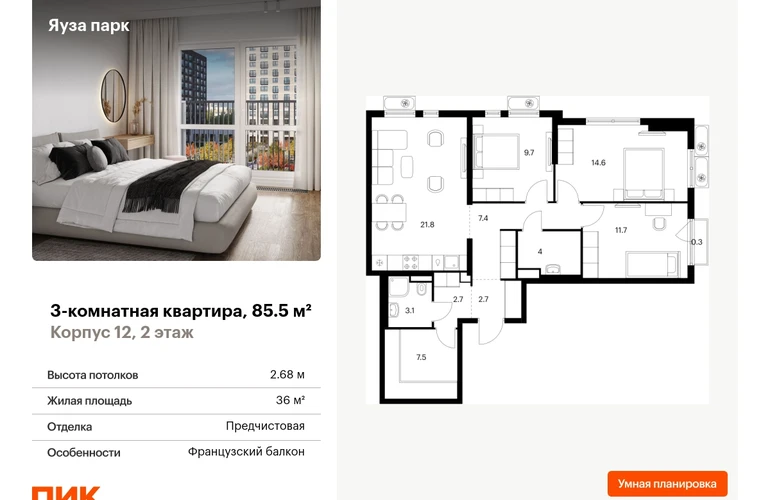 В Мытищах Московской области продаётся 3-комнатная квартира квартира площадью 85.5 на 2 этаже 24 этажного дома (корпус 12, секция 1) в проекте ПИК «Яуза парк». Удобное расположение 5 минут пешком до ж/д станции Мытищи и 20 минут на автомобиле до метро «Медведково». 3 минуты на автомобиле до Ярославского шоссе и 10 минут до МКАД. 8 минут пешком до ТРЦ «Красный кит». 20 минут пешком набережной реки Яузы и Мытищинского парка культуры и отдыха. Особенности проекта «Яуза парк» — современный квартал с архитектурой от известных бюро. В проекте будет вся необходимая инфраструктура. А удобные и разнообразные планировки позволят каждому выбрать квартиру для собственного сценария жизни. Преимущества проекта: Отделка:Предчистовая Особенности планировки: Гардеробная, Кухня-ниша, Кухня-гостиная, Два и более санузла, Французский балкон, Умная планировка Два детских сада на 225 и 350 мест, школа для 1170 учеников и поликлиника на территории проекта. Дворы-парки с детскими и спортивными площадками. Пешеходный бульвар для прогулок и отдыха с отреставрированной водонапорной башней XIX века. Магазины, кафе и полезные сервисы на первых этажах домов. Многоуровневые и подземный паркинги. АртикулО застройщике