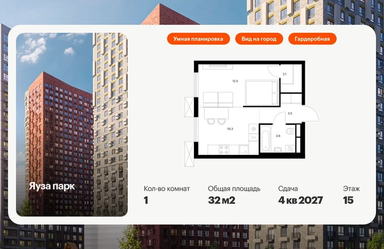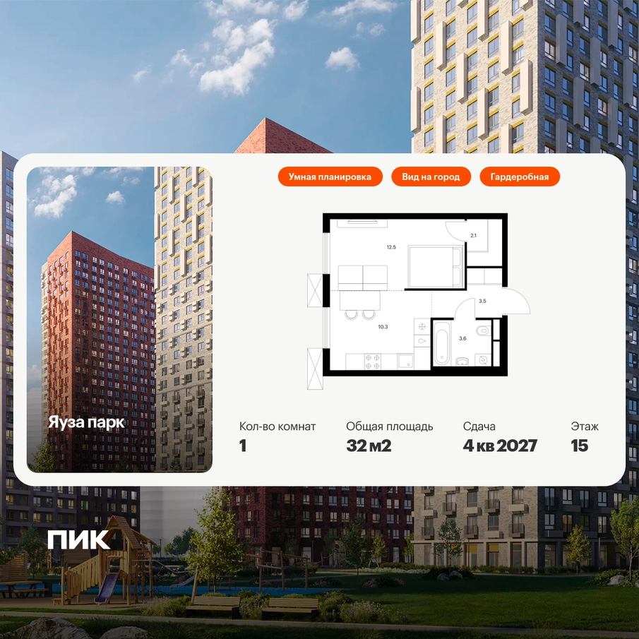 В Мытищах Московской области продаётся 1-комнатная квартира квартира площадью 32 на 15 этаже 24 этажного дома (корпус 10, секция 1) в проекте ПИК «Яуза парк». Удобное расположение 5 минут пешком до ж/д станции Мытищи и 20 минут на автомобиле до метро «Медведково». 3 минуты на автомобиле до Ярославского шоссе и 10 минут до МКАД. 8 минут пешком до ТРЦ «Красный кит». 20 минут пешком набережной реки Яузы и Мытищинского парка культуры и отдыха. Особенности проекта «Яуза парк» — современный квартал с архитектурой от известных бюро. В проекте будет вся необходимая инфраструктура. А удобные и разнообразные планировки позволят каждому выбрать квартиру для собственного сценария жизни. Преимущества проекта: Отделка:Предчистовая Особенности планировки: Гардеробная, Умная планировка Два детских сада на 225 и 350 мест, школа для 1170 учеников и поликлиника на территории проекта. Дворы-парки с детскими и спортивными площадками. Пешеходный бульвар для прогулок и отдыха с отреставрированной водонапорной башней XIX века. Магазины, кафе и полезные сервисы на первых этажах домов. Многоуровневые и подземный паркинги. АртикулО застройщике