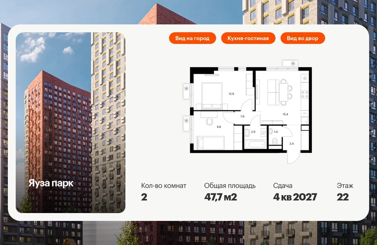 В Мытищах Московской области продаётся 2-комнатная квартира квартира площадью 47.7 на 22 этаже 24 этажного дома (корпус 12, секция 1) в проекте ПИК «Яуза парк». Удобное расположение 5 минут пешком до ж/д станции Мытищи и 20 минут на автомобиле до метро «Медведково». 3 минуты на автомобиле до Ярославского шоссе и 10 минут до МКАД. 8 минут пешком до ТРЦ «Красный кит». 20 минут пешком набережной реки Яузы и Мытищинского парка культуры и отдыха. Особенности проекта «Яуза парк» — современный квартал с архитектурой от известных бюро. В проекте будет вся необходимая инфраструктура. А удобные и разнообразные планировки позволят каждому выбрать квартиру для собственного сценария жизни. Преимущества проекта: Отделка:Предчистовая Особенности планировки: Кухня-гостиная Два детских сада на 225 и 350 мест, школа для 1170 учеников и поликлиника на территории проекта. Дворы-парки с детскими и спортивными площадками. Пешеходный бульвар для прогулок и отдыха с отреставрированной водонапорной башней XIX века. Магазины, кафе и полезные сервисы на первых этажах домов. Многоуровневые и подземный паркинги. АртикулО застройщике